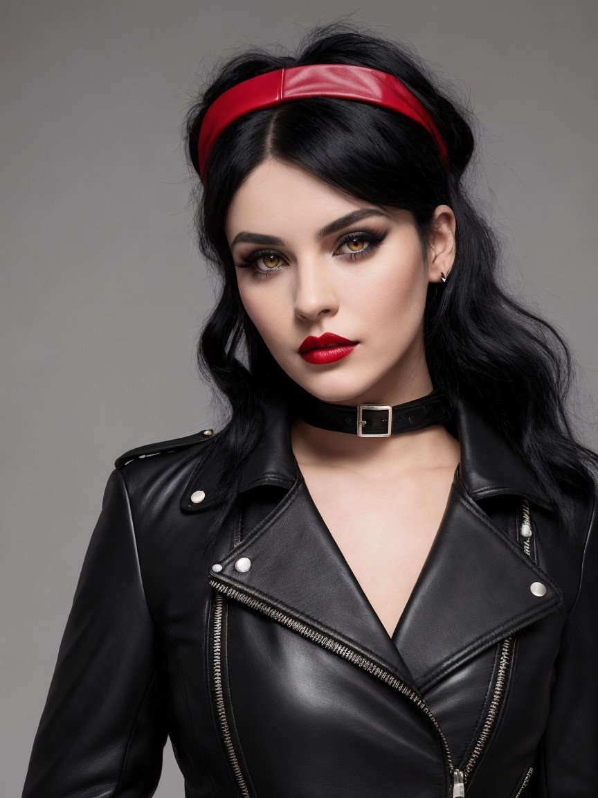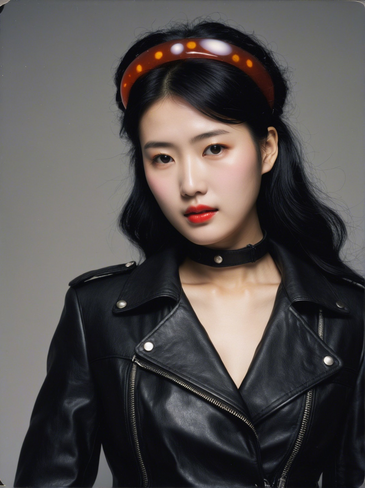 (Mix with a modified Prompt from marek zarnovicky) A young woman with long black hair poses elegantly, wearing a sleek black suit. She has a distinctive headpiece resembling an agate slice, adding a unique touch to her sophisticated look.