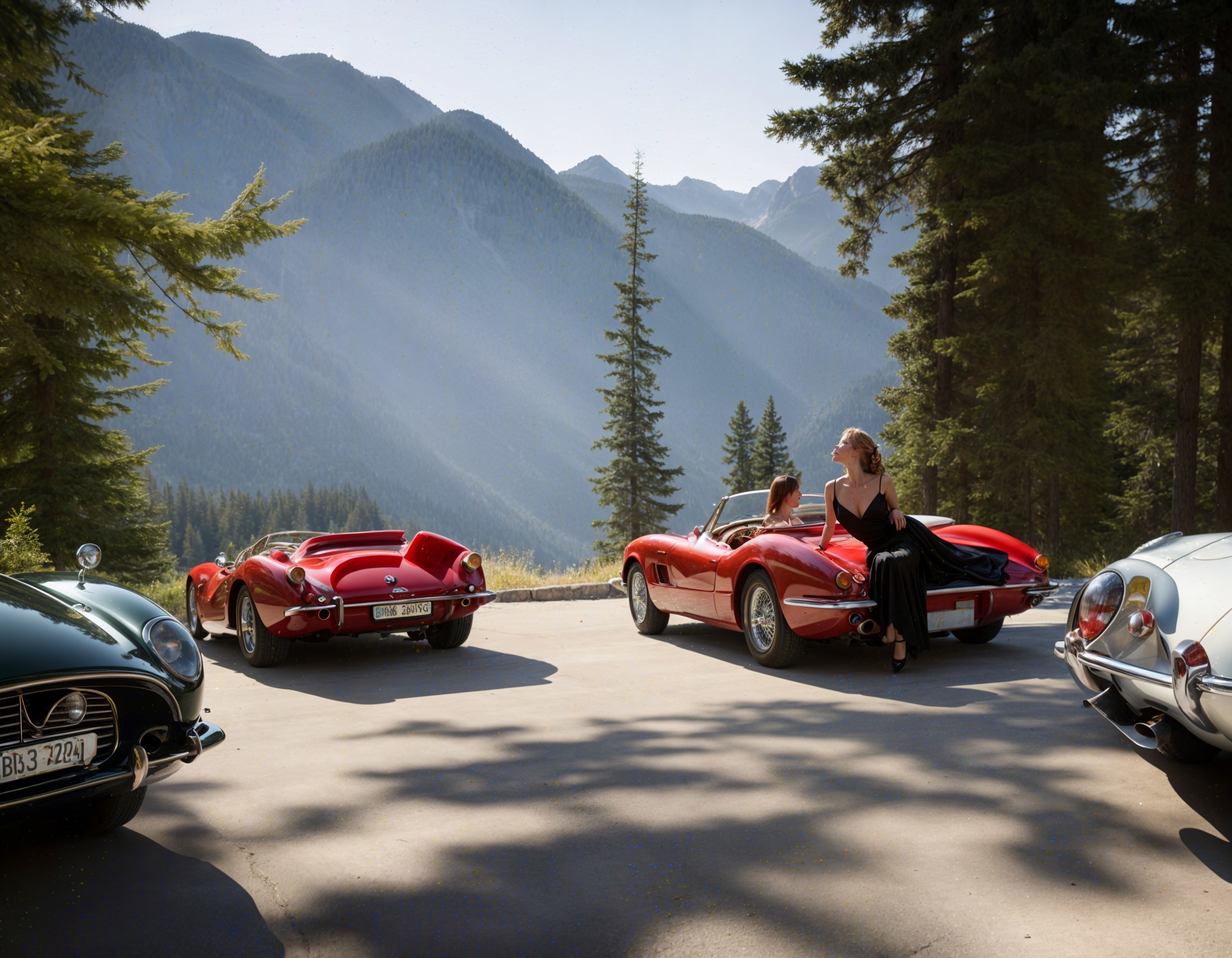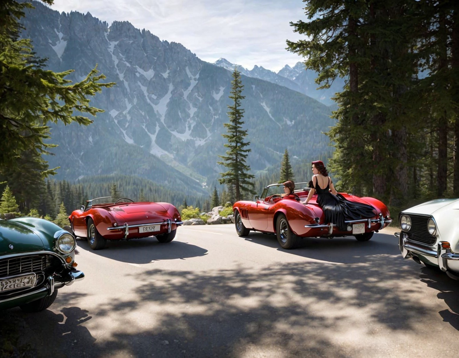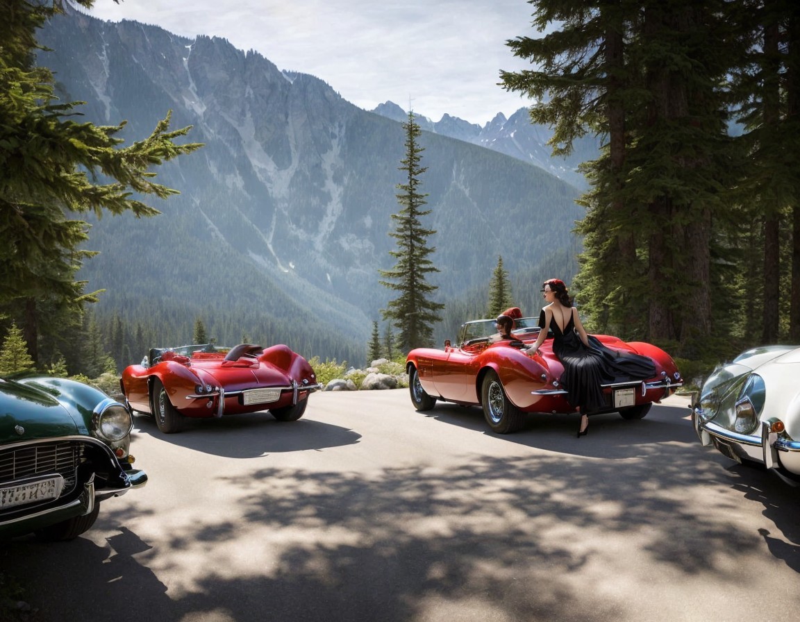 A scenic mountain backdrop features two classic red cars beside a woman in a black dress, with additional vintage cars parked nearby, surrounded by lush trees and dramatic peaks.
