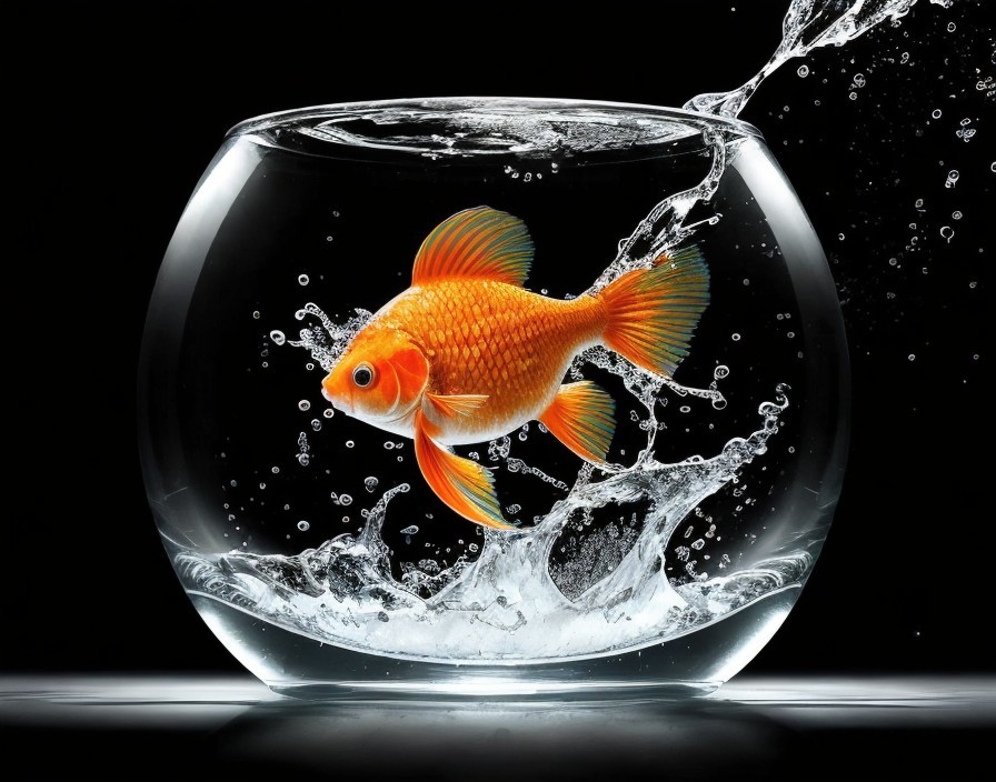An orange goldfish is swimming in a bowl with water splashing around it, against a dark background.