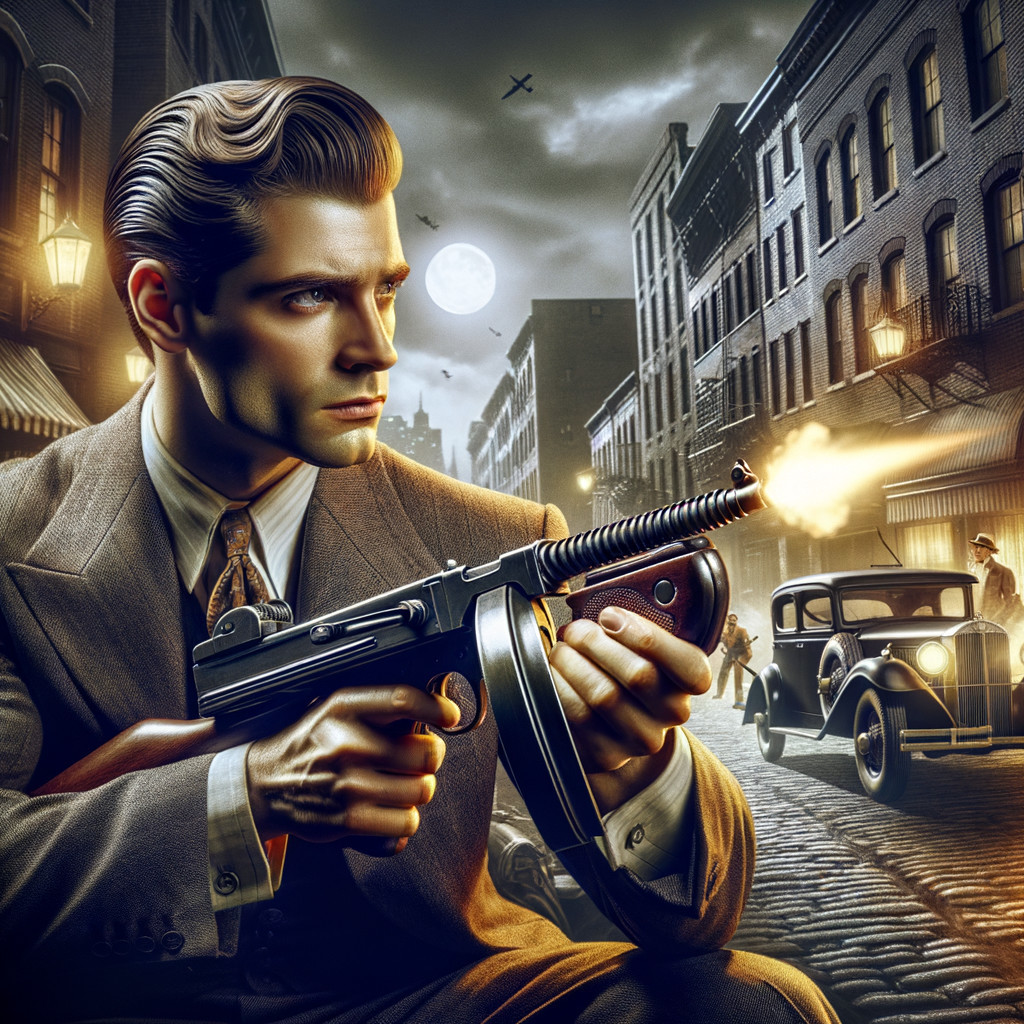 A stylized illustration of a James Cagney in a suit aiming a Tommy gun, with a vintage car and cityscape in the background.