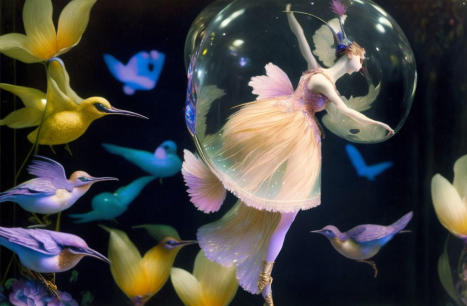 Woman in white and gold attire in transparent bubble surrounded by vibrant plants and birds.