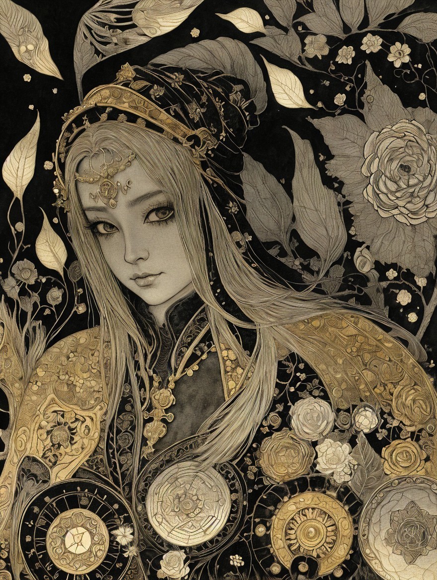 Legend of the Girl of the underworld. Medieval Japanese Artists Sumi-e Style, Velvet Black, Shabby, Dull Gold, Amber Gray, Golden Ratio, Surreal Fantasy, Elegant, High Definition Ultra Fine 3D Line, Zenangle Style, Watercolor Patchwork ,
