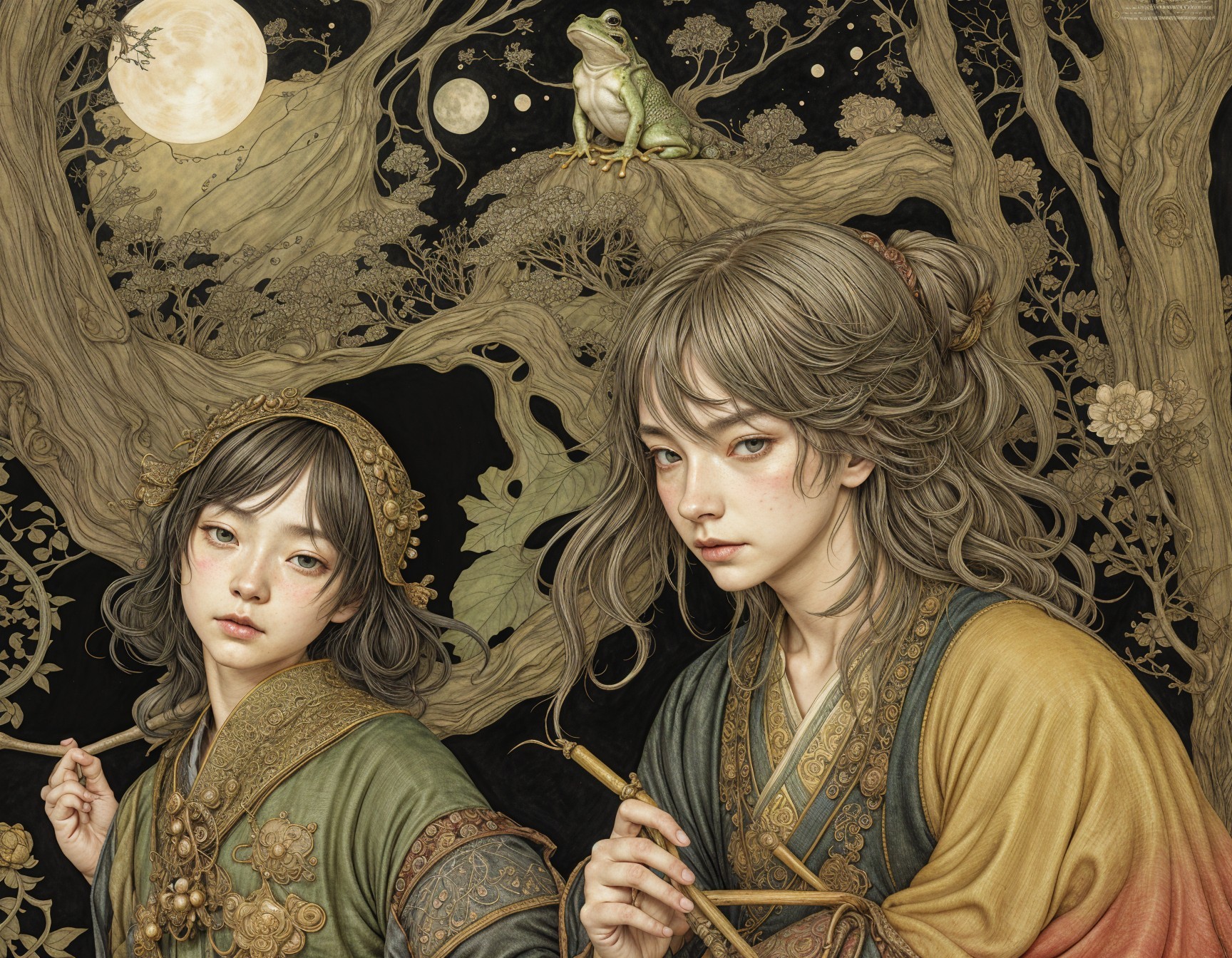 A young child in traditional attire sits on a lily pad, holding a fruit, with a frog nearby. In the background, serene mountains and a traditional house reflect in the water. An open book lies beside them.