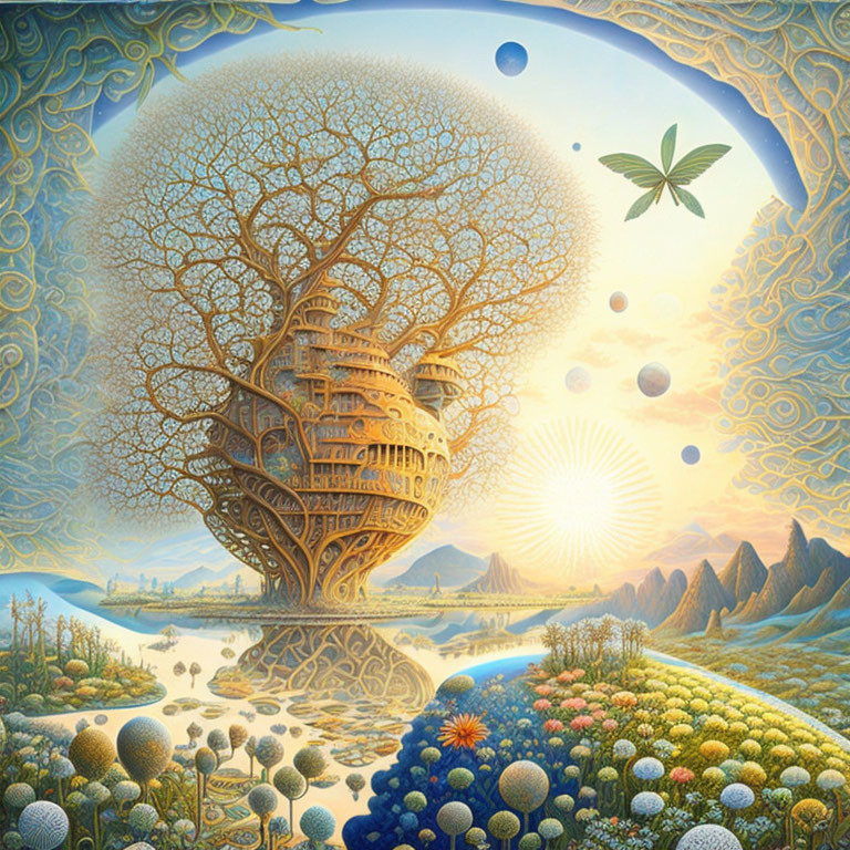 Fantastical landscape with treehouse, intricate patterns, vibrant plants, sun, and orbs under clear