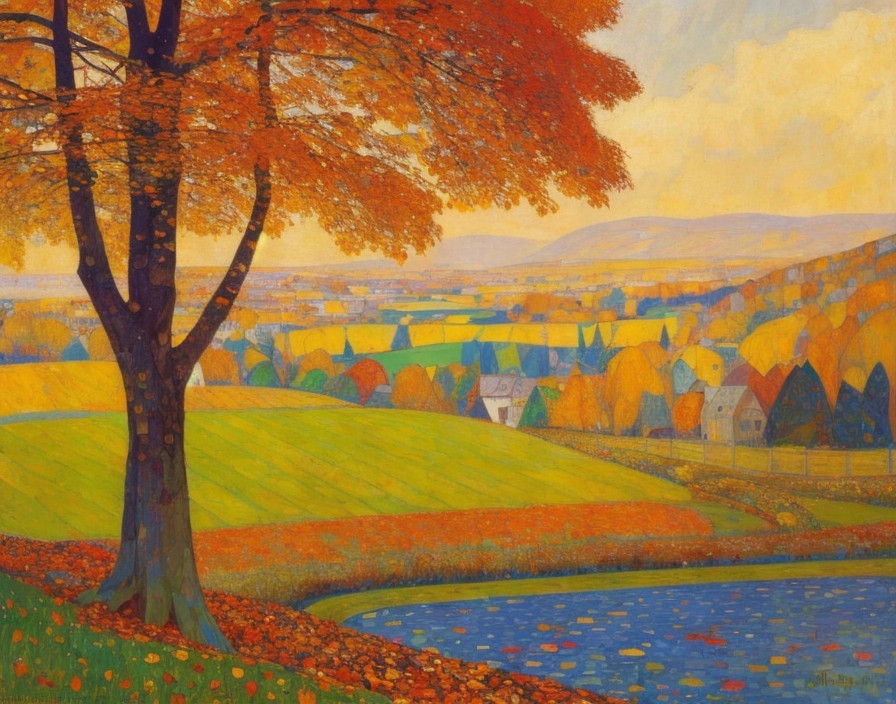 Prompt: autumn view, Albert Gleizes, Joseph Stella, (color by Gustav Klimt:2.5), (style of Frances MacDonald McNair:03), minimalism, landscape format full width full height single image