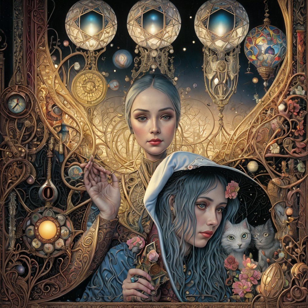 Prompt: bokeh Nikon D850 dof extremely detailed cinematic postprocessing art by Jasper Johns, Margaret Keane, Ray Caesar, Craig Davison, Mark Ryden, Fragonarda Ultra realistic a photorealistic painting by Margaret Keane, style of mark ryden HDR, beautiful, 3D image effects The overall style is contemporary and surreal, with a touch of realism, giving the portrait a unique and artistic appeal.