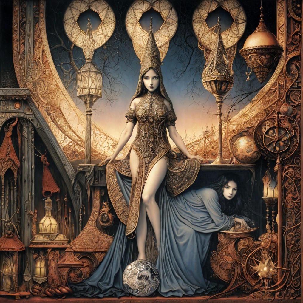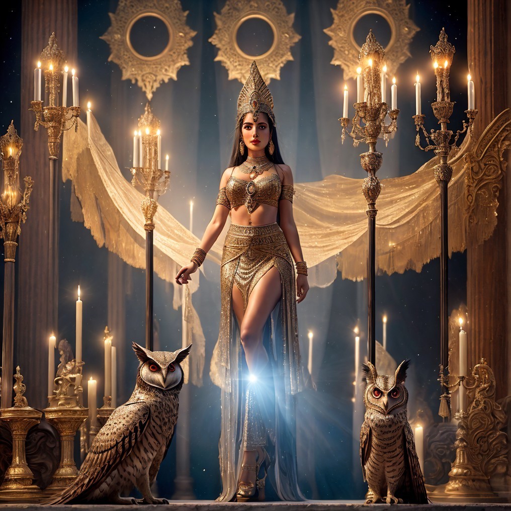 + Prompt:Ishtar: a Sumerian Mesopotamian goddess is standing on the mysterious stage in the spacious hall of the Venice opera theater, burning candles, beautiful intricate bronze candelabras, two owls with glowing eyes are each on each side of her stand on ancient columns, sharp focus, surreal painting, By Leonora Carrington & Didier Laurence & Naoto Hattori & Nicoletta Ceccoli & Bernard Frize & Gunta Stölzl, James Jean, Mark Ryden, Brian Froud, Zdzisław Beksinski, Hieronymus Bosch, Imperial colors, Elegant, Polished, Masterful surrealism
