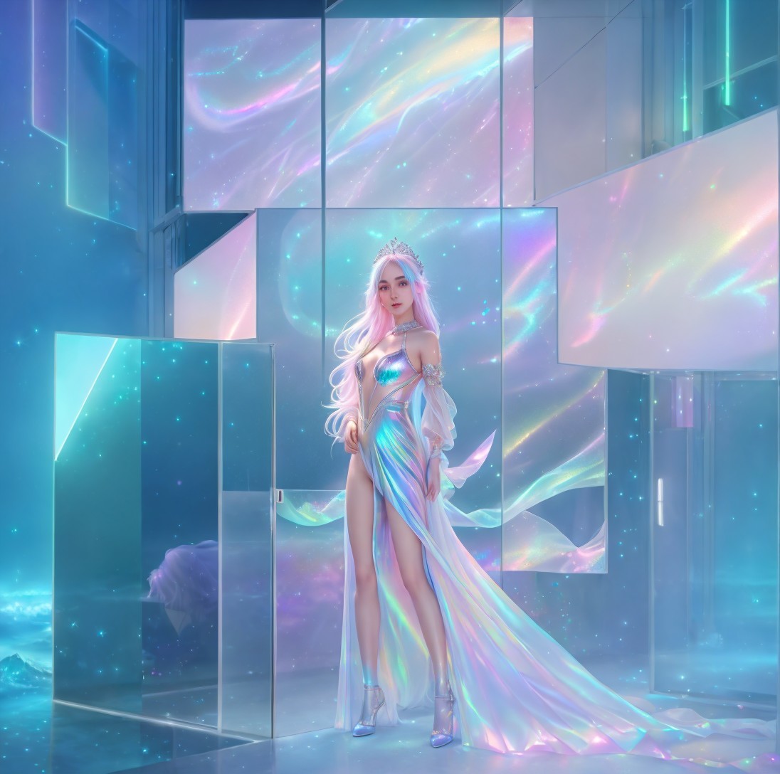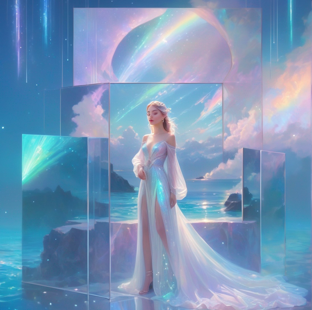 + Prompt:An ethereal girl in font of magical pastel iridescent sparkly holographic radiant portal opening to sparkly sea, gloss, radiance, ethereal, perfect, very beautiful, magical, luminous, bioluminescent glow, glitter, shimmer, sparkle, Art by guweiz, WLOP, bella kotak, peter mohrbacher