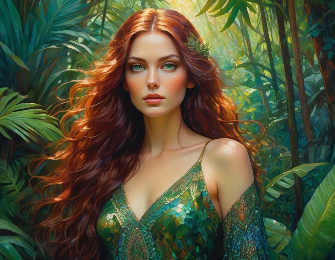 An illustrated woman with flowing red hair and green eyes amidst a vibrant jungle backdrop, wearing a green dress.