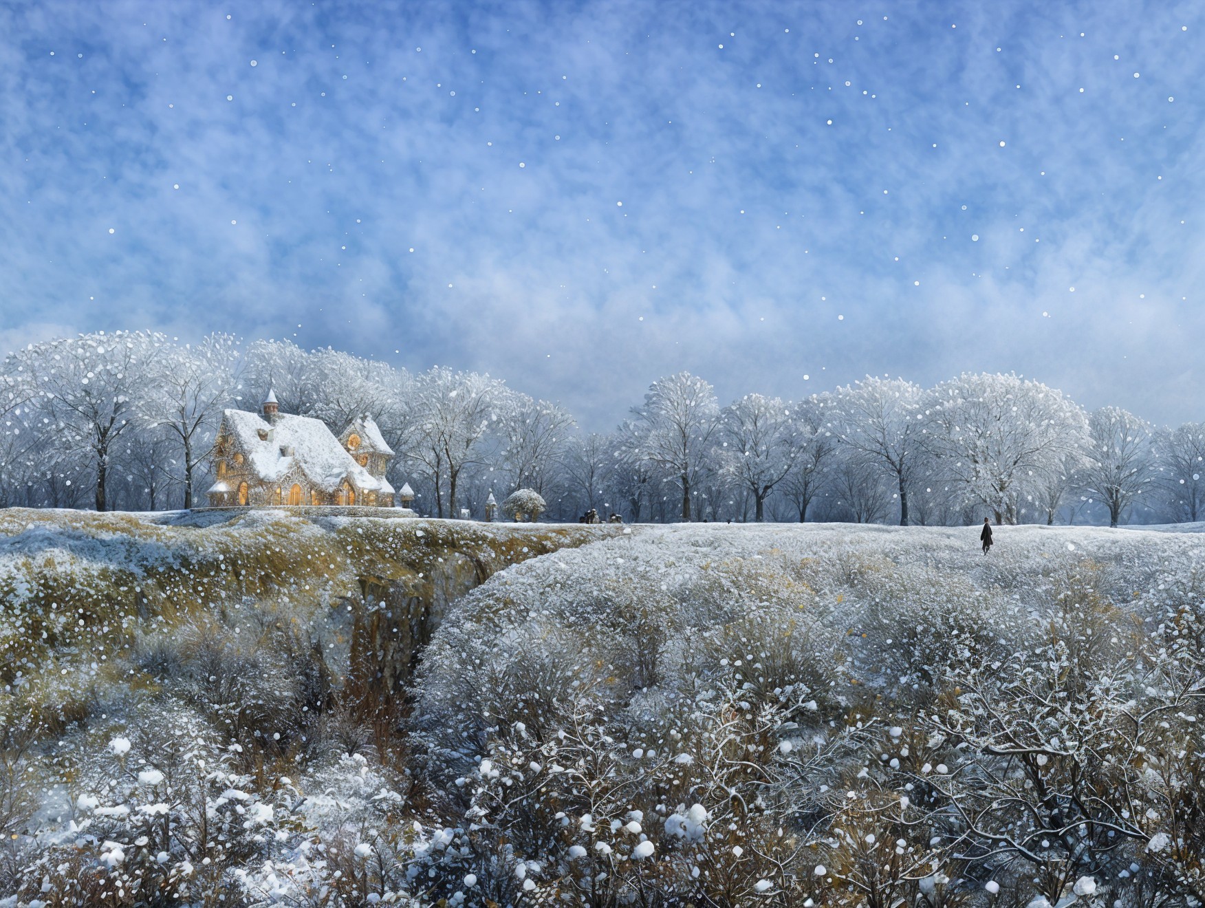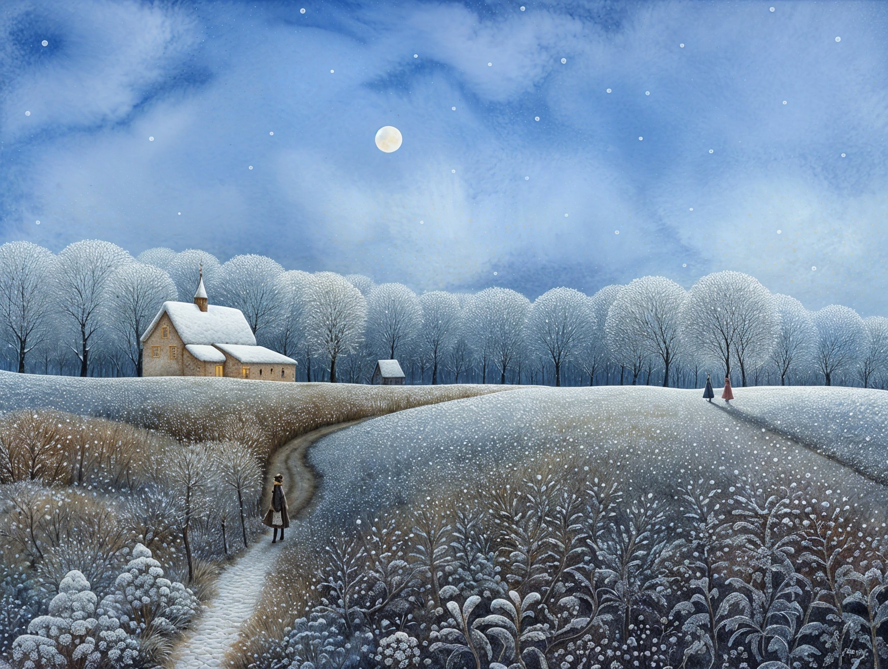 A serene winter landscape features a cozy cottage under a glowing moon. Snow blankets the fields, and a solitary figure walks along a winding path amidst frosty trees and delicate flora.