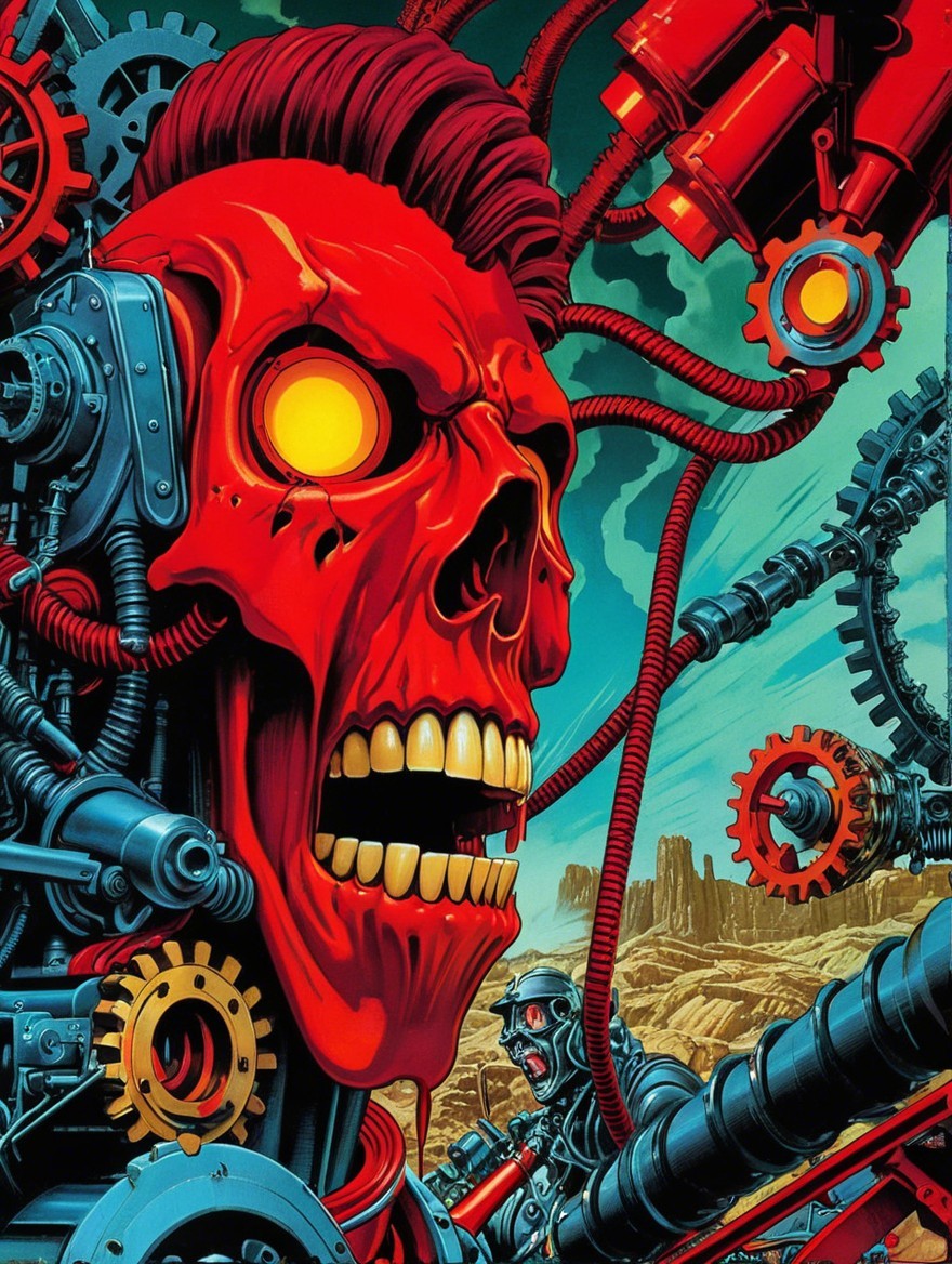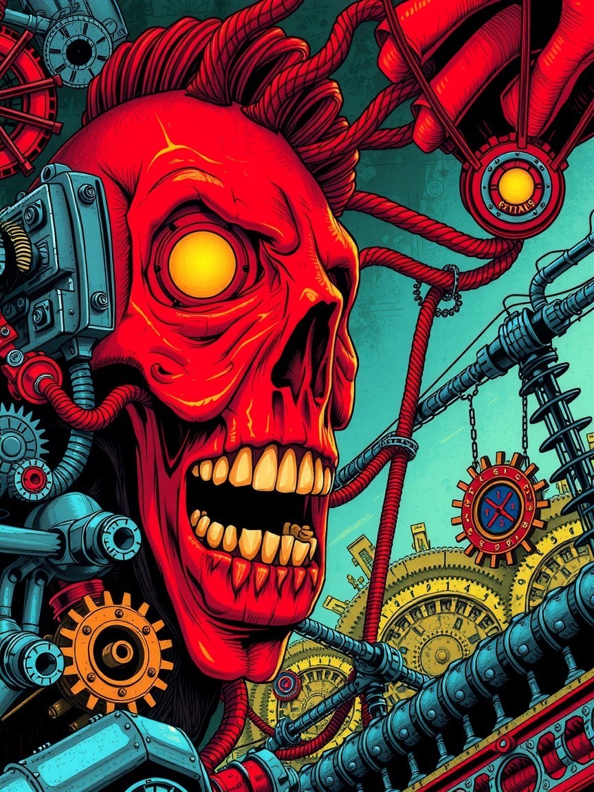 Prompt: "Scream Machines—engines shriek like tortured steel, gears gnash in frenzy, a ride into madness where metal howls and minds unravel in mechanical delirium."