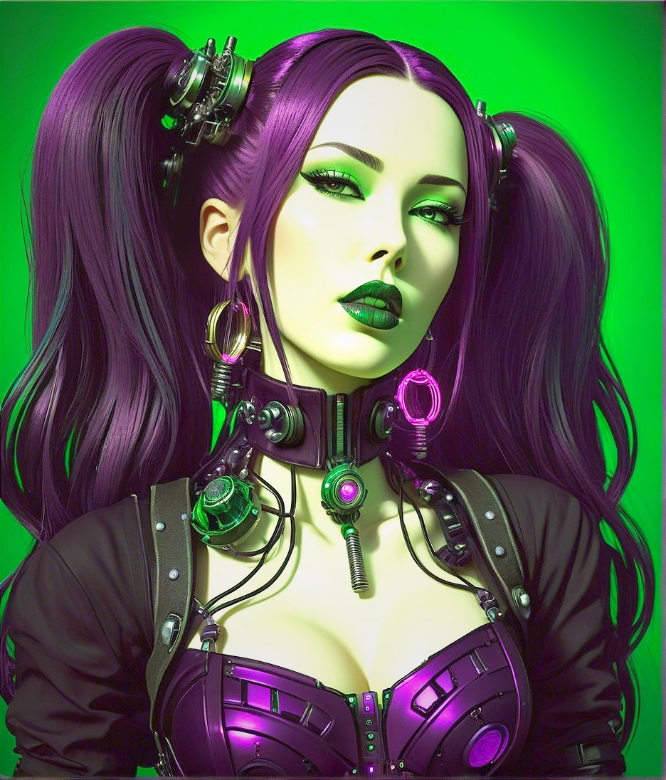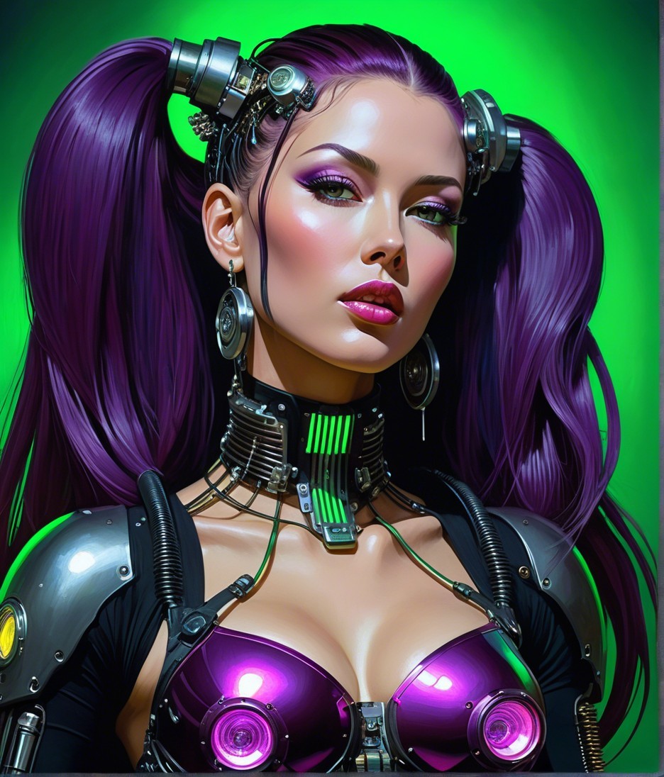 Stylized gouache portraiture, colossal, metallic colors, stylized cyberpunk temptress with a bulbous.mechanized collar and torso, intricate digital circuitry and greebles,, biomechanical details, brush textured hues by John Berkey and Steve hanks, muscular,flourescent, cyberpunk, erotucism, luminosity 1.3, ornamental details, triadic color scheme black green mauve, dreamscape, dystopian, hallucinatory, biolumiscent, biomorphic, biomechanical details, coffinwood 1.7, impasto, shabby, filaments, mixed dripping sensibilities. Stylized 1970s advertising style, biomorphic serpentine pipes that contort over her attire, lacquer wear with biolumiscent visceral mechanical devices, mechanical details, tactile textures, plastucity, marinism, biomechanical neurons, filigree,, inspired by streamline_moderne, dark fantasy style, stained, fine crackles, metallic stains, dethereal mixture of organic and technological layering, digitized papillary lines. Fabric textures, divisionism, plasticity 1.6, complexion 1.4, custom_loss:edge, contouring lines, cool, synthetic, modern, abstract brushstroke art, filigrane, 3 layers of dof, dynamic lighting 1.7, raytraced shadows 1.8,, quilling, swirly details, close-up, style of Georgia O'Keeffe and Overton Loyd and frank Fazetta, fractalization, 3d effects 1.8,ambient occlusion 1.2, octane render