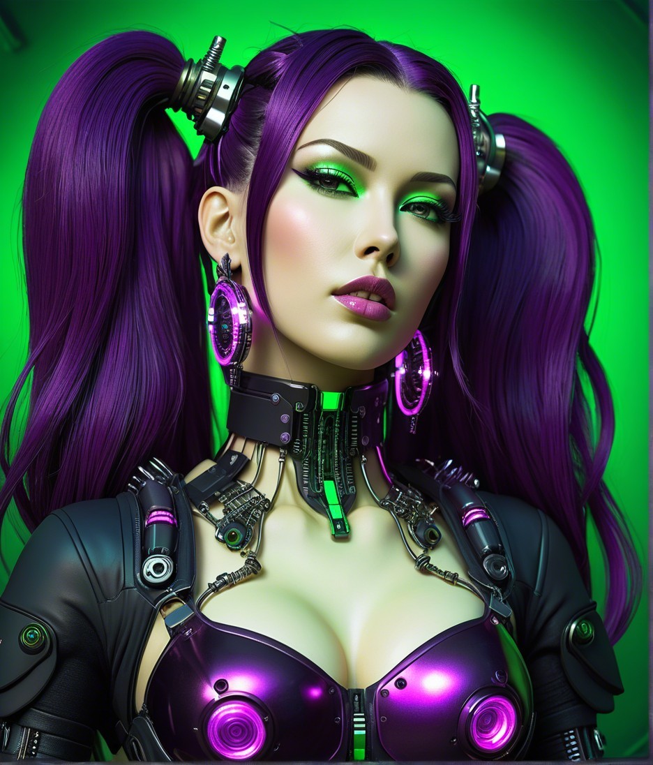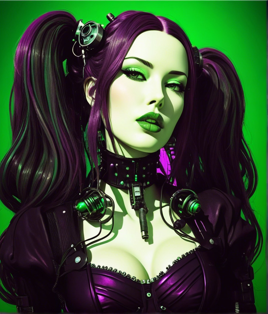 colossal, metallic colors, stylized cyberpunk temptress with a bulbous, mechanized collar and torso, intricate digital circuitry and greebles,, biomechanical details, textured, triadic color scheme black green mauve, dreamy glow, dystopian, hallucinatory, coffinwood 1.7, impasto, aesthetically shabby, filaments, mixed patchwork, dripping sensibilities. Stylized hybrid cyborg woman, 1970s advertising style, biomorphic serpentine pipes that contort across her attire, visceral mechanical organisms. Kinetic, photorealistic detail, tactile textures, biomechanical neurons, filigree touches, inspired by blade runniner movie, dark fantasy style, stained, fine crackles, metallic stains,, dethereal mixture of organic and synthetic layering, digitized papillary lines. Fabric textures, divisionism, plasticity 1.6, complexion 1.4, custom_loss:edge, contouring lines, filigrane,