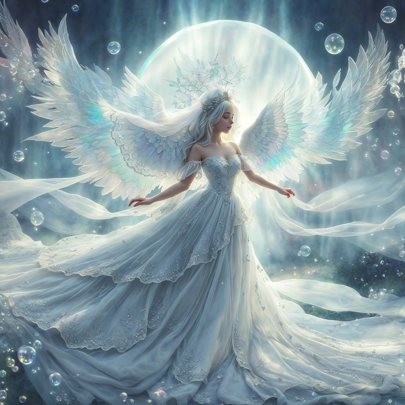 Magical impressionism. Impressionism with a touch of magic. Tiny Bubble on the dress. Opalescent, Luminiscent, evanescent, Pen and ink photography . The angelic creature is full body and appears to be divinely lit. NO WINGS .Rich, warm colors. Emotional pen and ink Hallucinatory, fantasy, ethereal, dreamy, emotional, evocative, watercolor.Style Renoir, Kotler, Dega, Paul Klee..wyeth, Magritte.Rutkowski. Anatomicalycorrect in perfect body,perfecet face , ultra hd, realistic, vivid colors, highly detailed, UHD drawing, pen and ink, perfect composition, beautiful detailed intricate insanely detailed octane render trending on artstation, 8k artistic photography, photorealistic concept art, soft natural volumetric cinematic perfect light