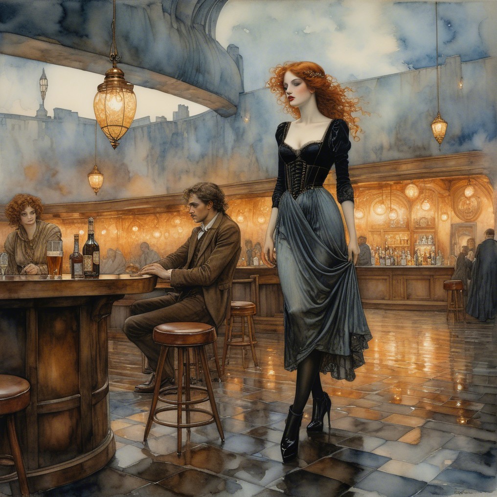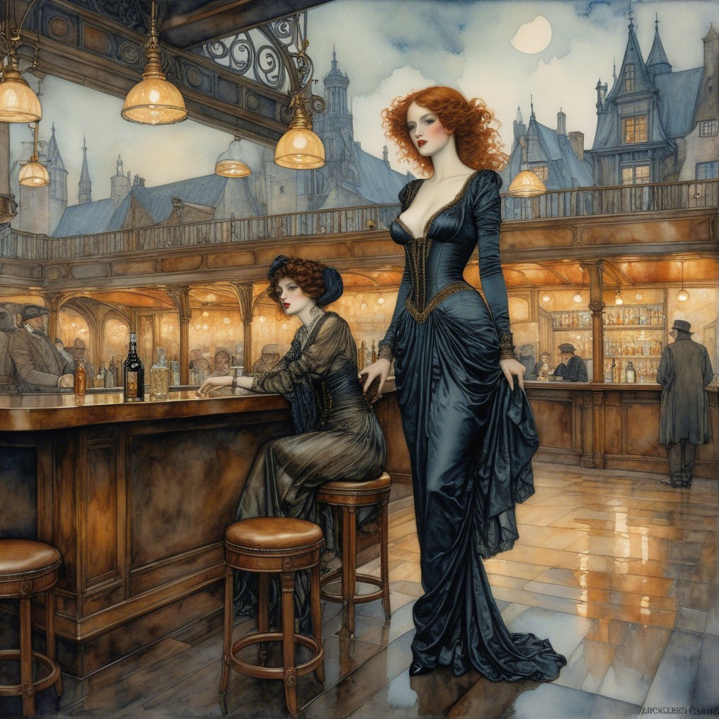 In a vintage bar setting, two elegant women in dramatic gowns sit among ornate decor. One stands confidently, while the other gazes thoughtfully, surrounded by an ambiance of sophistication.