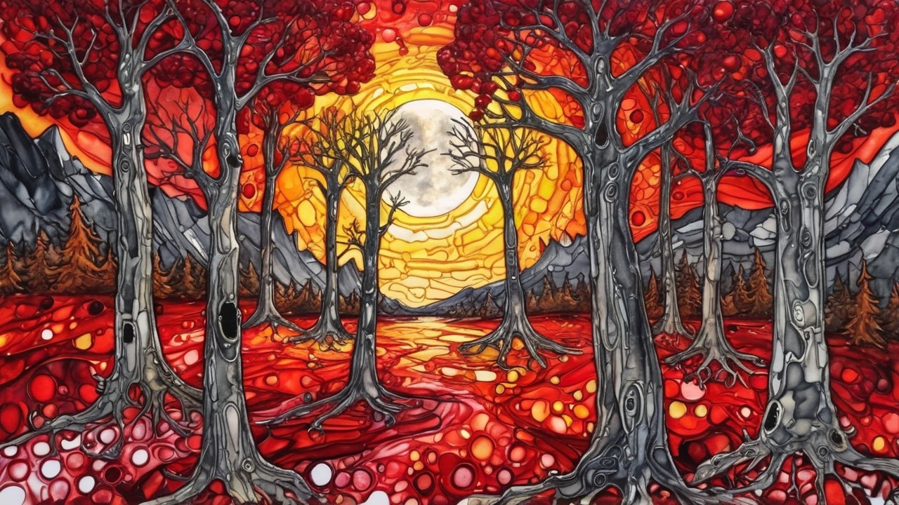 The creations of mentally ill patient become halos of fallen angels::alcohol ink, art extraordinary, heavy thick impasto :: hues of rich red, gray, and gold :: splash ink, drips, Schizophrenia art progression of Louis Wain. Detailed, complex, chaotic arabesque forest trees::A fragmented sliced into thin, angular layers, each layer slightly askew, exuding a disquieting sense of depth of horror, reminiscent of the occult atmosphere in thick with an air of creepy, low-brow art, photobashed pop surrealism, reminiscent of the works of Seurat, Redon, and Turner, with a dash of Beksinski's signature, dark, symbolic style. The overall effect is a blended, photorealistic art style, with elements of Molzahn's bold, graphic forms, Hockney's vivid, pop-art colors, and Caulfield's whimsical, surreal landscapes, infused with the dystopian, bio-horror feeling of a Craig-Martin, Voynich, or Luigi Serafini-inspired, eerie, dreamlike world.