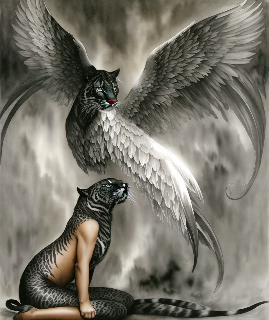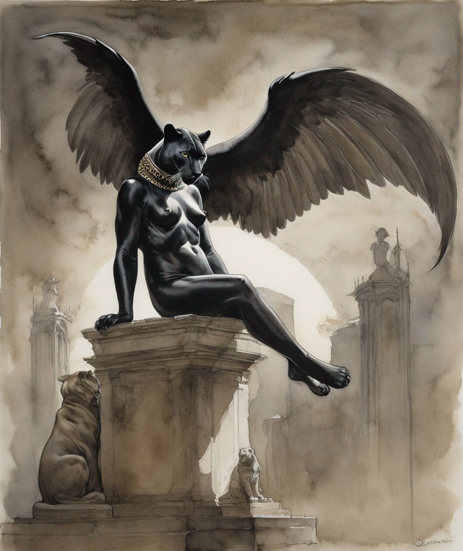 A majestic black panther with extended bat-like wings perches on a rock, exuding a mythical and powerful aura.