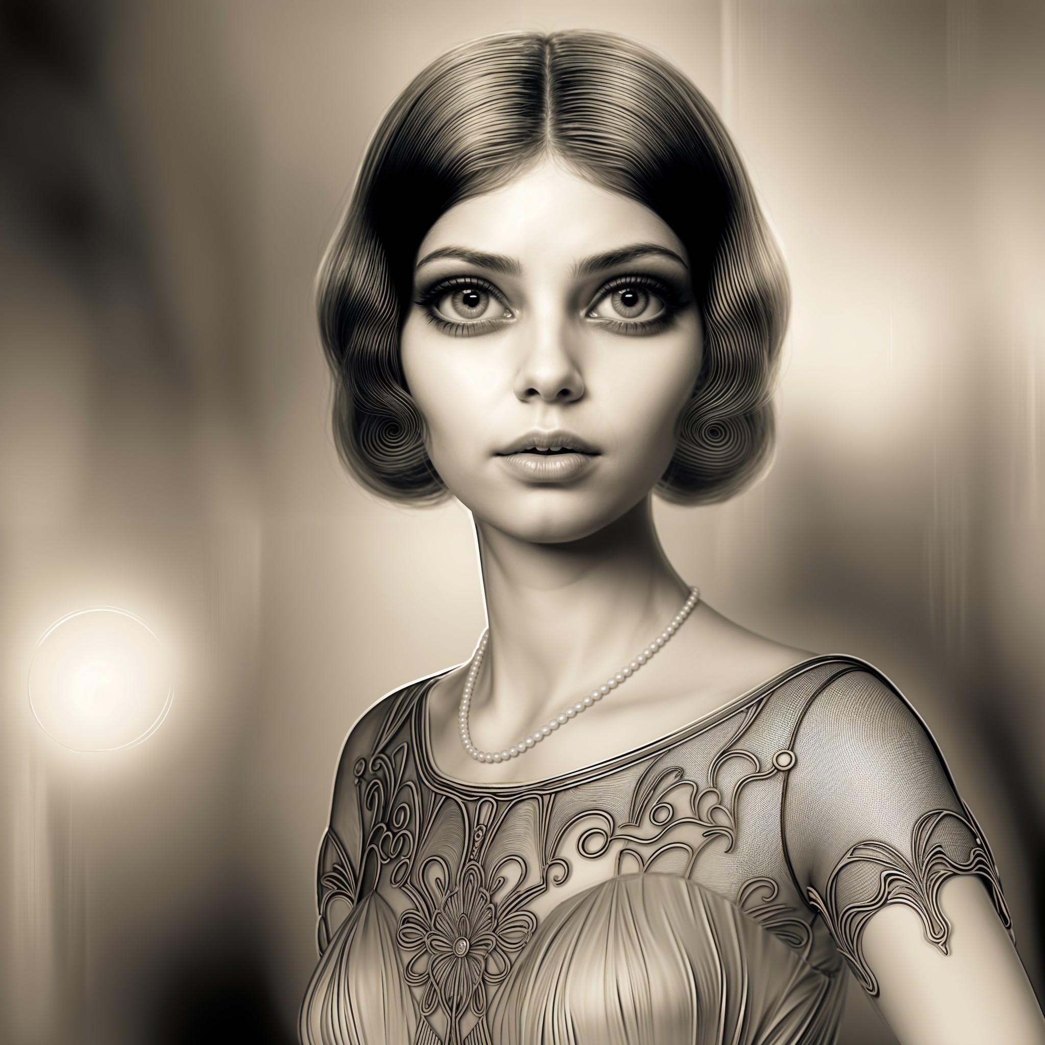 Prompt: "Radiant young woman, elegant attire, captivating gaze, 1920s beauty, delicate features, soft brushstrokes, big expressive eyes, intricate details, masterful use of light and shadow, subtle background, timeless beauty, oil on canvas, classic portraiture style, reminiscent of the old masters, Jazz Age mood, Artstation."