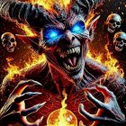 A fierce blue-skinned creature with glowing orange eyes and fiery horns stands menacingly. Spiky armor and a sinister grin enhance its terrifying presence against a dark, mystical backdrop.
