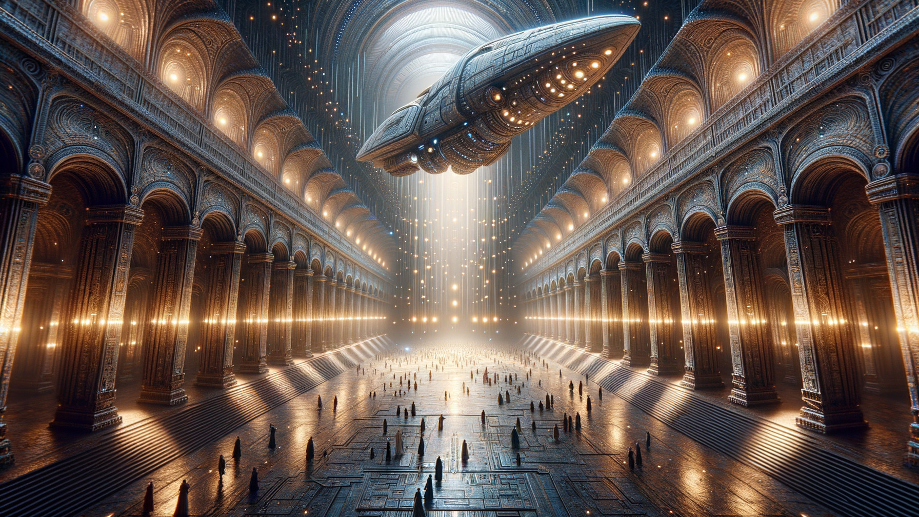A high-angle, long shot digital fantasy painting shows a space vehicle hovering above a crowd of people in a futuristic, grand architectural hall. The vehicle is long and boat-shaped, resembling a gray submarine or airship, with numerous circular illuminated windows emitting warm white light from its underside. It is