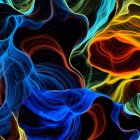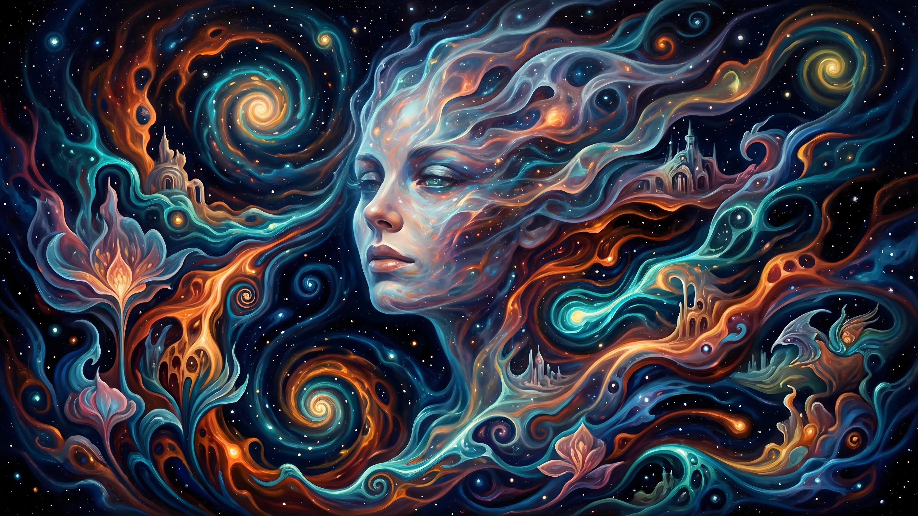 A highly detailed fantasy digital painting of a woman with long wavy iridescent glowing hair flowing towards the right side of the frame, with her face gazing upwards to the left. She has vibrant blue eyes and glowing skin with flecks of brightly colored particles emanating from her. Her hair is composed of glowing abstract cosmic