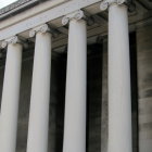 The image features the grand façade of the Mellon Institute, characterized by towering white columns, a stone exterior, and a set of prominent stairs leading to a grand entrance.