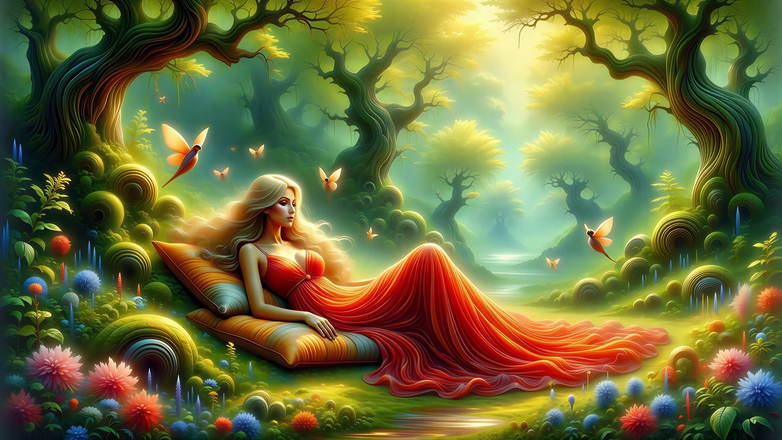 A beautiful young woman with long blonde hair, wearing a flowing red dress, is reclining on an orange cushion amidst a vibrant, fantastical forest. The forest is filled with twisted, ancient-looking trees with green foliage and glowing yellow leaves, and the ground is covered in lush green grass. Numerous colorful,