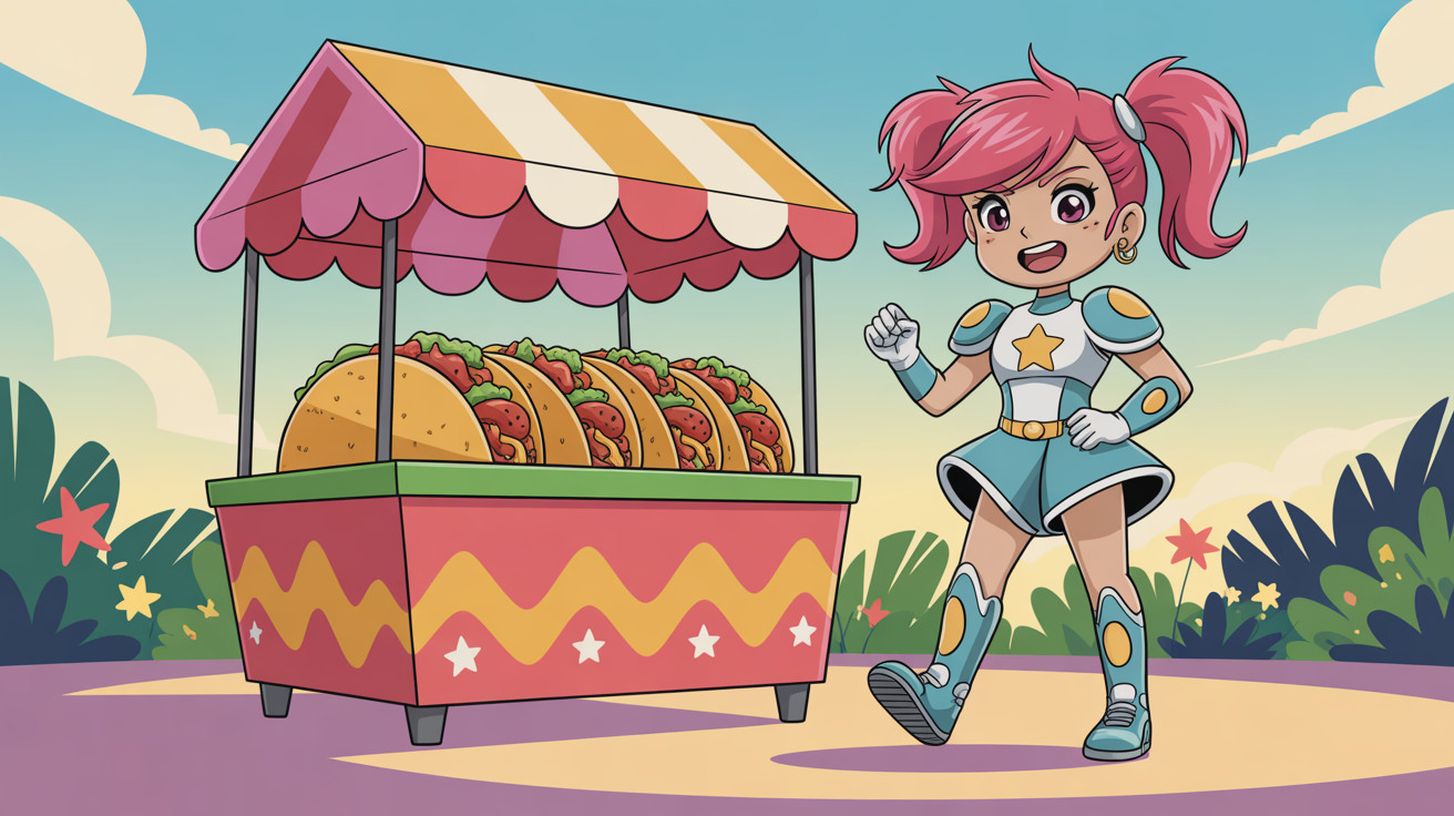 A charming anime superheroine runs a vibrant taco stand, serving delicious tacos while using her powers to protect the community. Her colorful outfit and cheerful demeanor attract customers and spread joy.