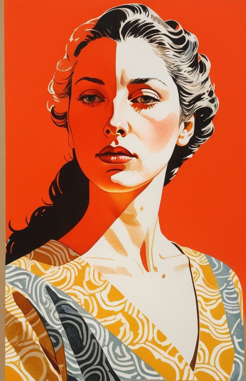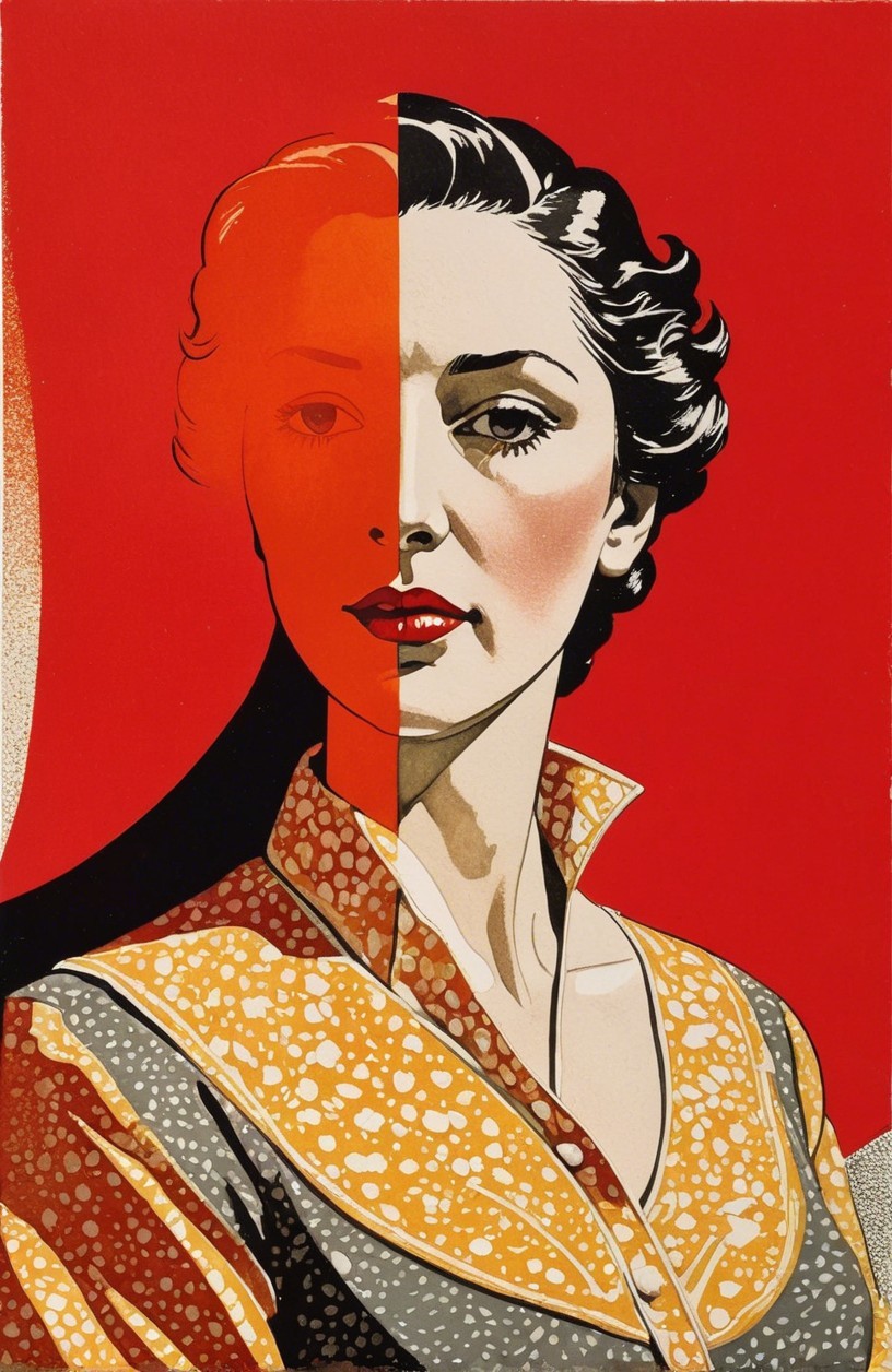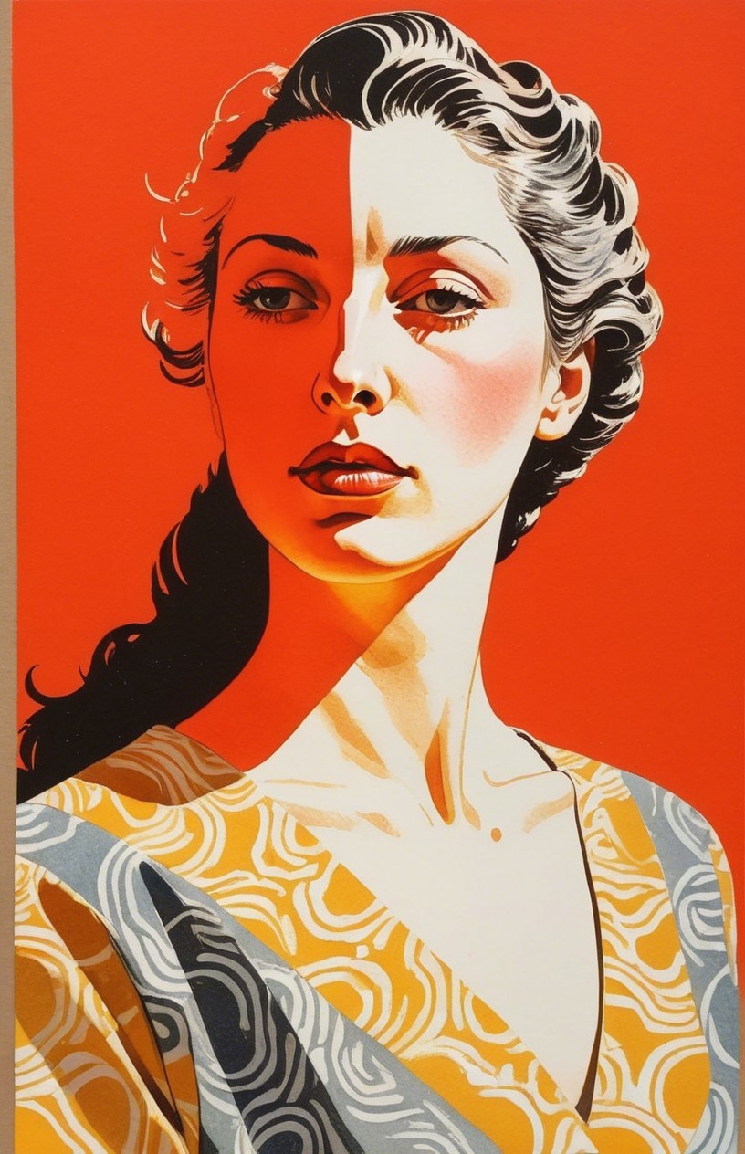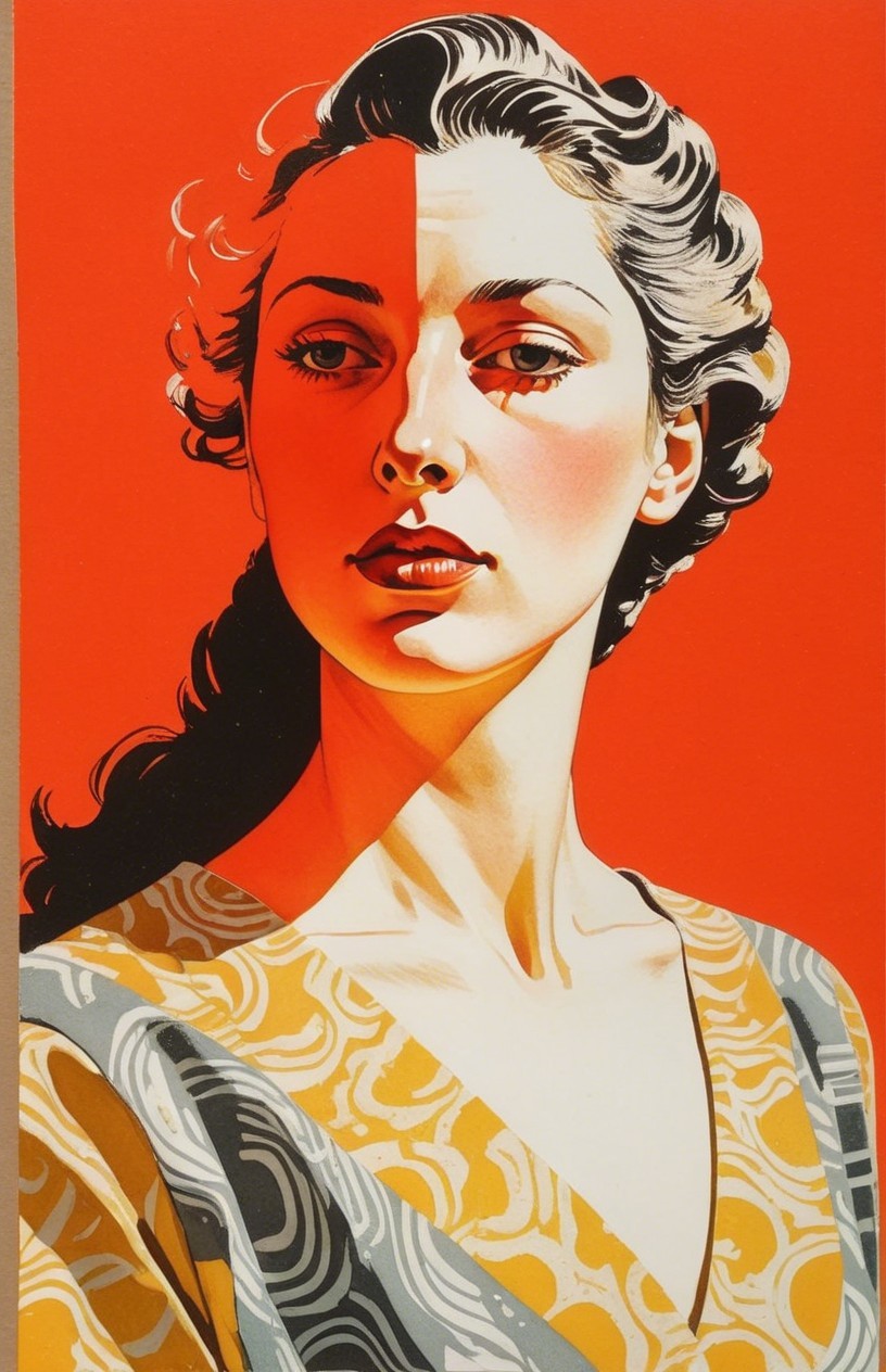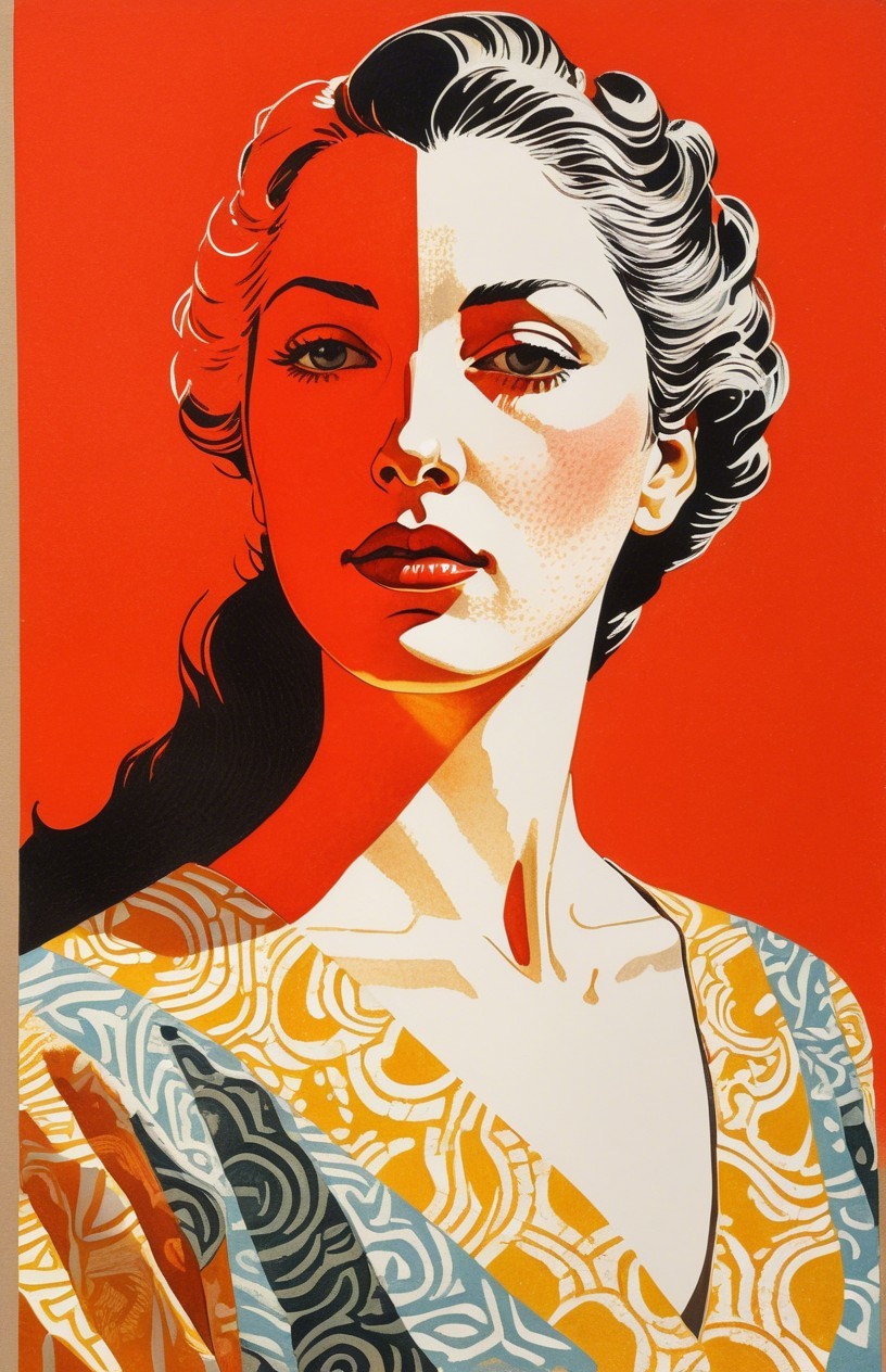 Prompt: painstakingly exact linocut and watercolor wash technique, stylized female headshot by Lucian Freud, side view. Mysterious, gradients of red and dark-white, hues by Sam Toft, mulit-layered eyes, unique, moonlit night setting, looming shadows, intricate carvings, hidden mystical atmosphere, ethereal glow, haunting presence, subtle reflections, allegorical, cinematic lighting, detailed textures, foggy ambiance, matte painting style, high contrast, vivid colors, dappled and rimmed shimmer, low key lighting, contrasting textures, tangled geometric features, translucent and obscuring elements, best quality, by a master matte painter similar to Ed Binkley, angled, close up, lithography reminiscence, gorgeous 1980s fantasy figurine, light leaving across edges before melting into background, cheeky, saucy, perky, fresh, jauntry toned comic book cover art, stippled, embedded three-dimensional structure of patterns and fields, tesselated, cel-shaded, angled, upper body portrait with phong shading, collage style, gradients, high coloring, phong shading 1.7, diffuse lighting and reflections, colored sgraffito in zentangle lines reminiscent of Francis Bacon and Georgia O'Keeffe and Jim Davis, abstract piece with high contrast, featuring asymmetrical designs and intricate shading, fusion of Ho Baron & Endre Penovac's essence, coloring techniques inspired by William Bradley and Carne Griffith's coloring style, paper-cut art techniques, lines by William Bradley, sawtooth wave, negative lucas numbers, Psychosomatic surrealism by Gayane Khachaturian, warm yellow pastel color palette with gradients. Embodiment inspired by Ernst Haeckel, micropen and ink coloring in hues, divisionism, impossible light transitions, angled, champlevé, merged styles of Devin Allen & Paul Kidby, hues by Overton Loyd, 3 point lighting, handsome sketch art approach by Susanne Mason, hues by Ho Baron, incorporating elements of American Gothic and a merged style inspired by Chester Gould, Man Ray, and John Buscema, impossible light transitions, emulsion lifts, whimsical linwork elements, ancient, contoured, blurred background, angled, squiggly outlines, upper body portrait with decay, savage, feminity, vintage vibes, natural, dyed cubist reminiscence by Ed Emshwiller and Catherine Abel, lighting and embodiment by Man Ray, squiggly line-art with pointilism, joyful, easy, pop-art reminiscence