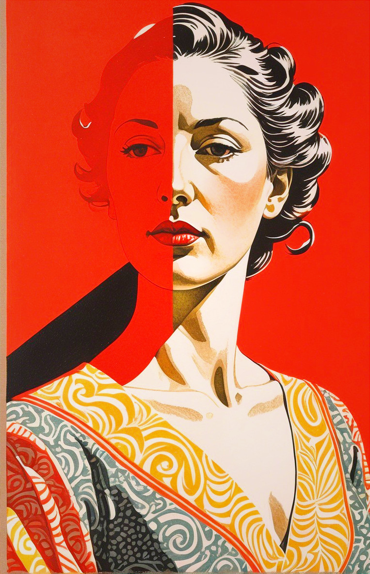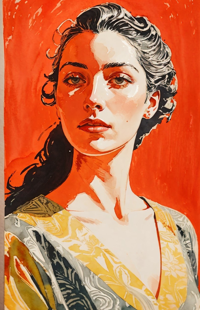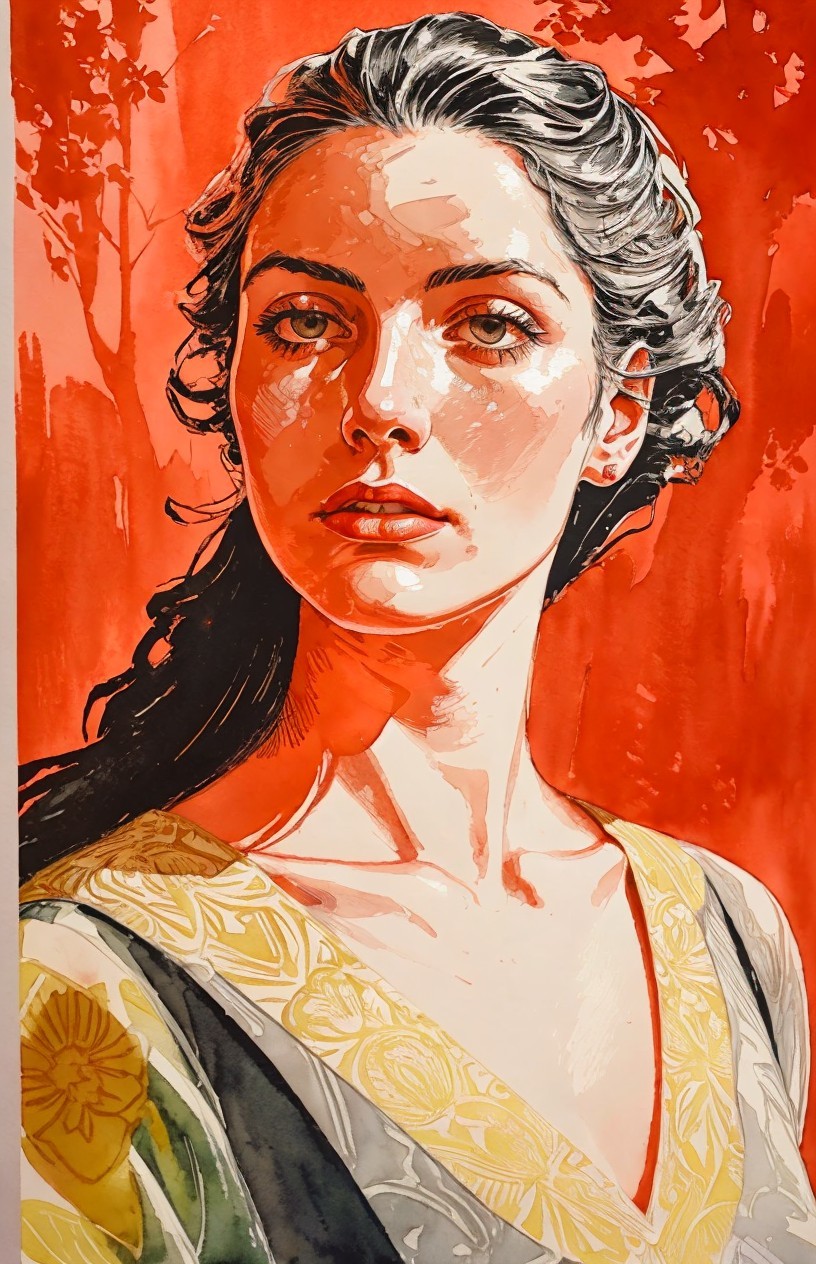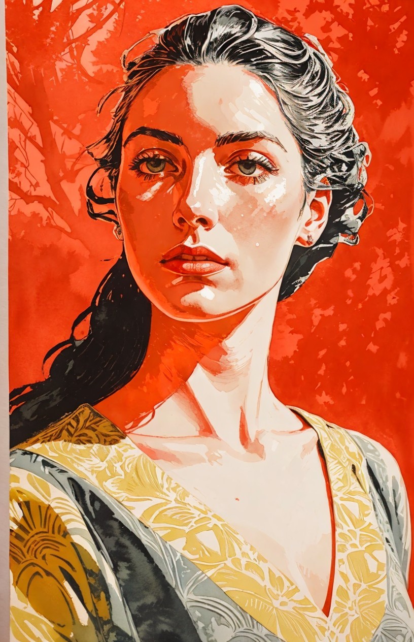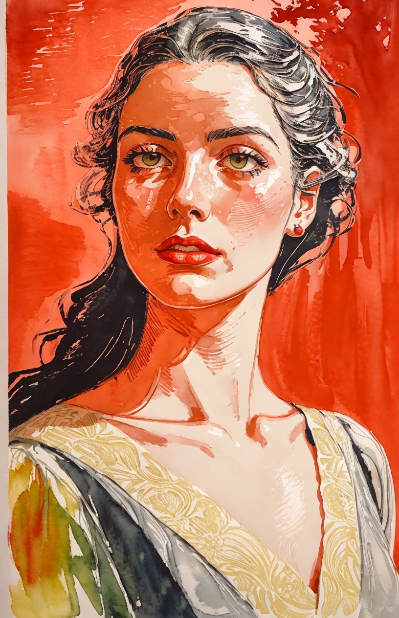 Prompt: painstakingly exact linocut and watercolor wash technique, stylized female headshot by Lucian Freud, side view. Mysterious, gradients of red and dark-white, hues by Sam Toft, mulit-layered eyes, unique, moonlit night setting, looming shadows, intricate carvings, hidden mystical atmosphere, ethereal glow, haunting presence, subtle reflections, allegorical, cinematic lighting, detailed textures, foggy ambiance, matte painting style, high contrast, vivid colors, dappled and rimmed shimmer, low key lighting, contrasting textures, tangled geometric features, translucent and obscuring elements, best quality, by a master matte painter similar to Ed Binkley, angled, close up, lithography reminiscence, gorgeous 1980s fantasy figurine, light leaving across edges before melting into background, cheeky, saucy, perky, fresh, jauntry toned comic book cover art, stippled, embedded three-dimensional structure of patterns and fields, tesselated, cel-shaded, angled, upper body portrait with phong shading, collage style, gradients, high coloring, phong shading 1.7, diffuse lighting and reflections, colored sgraffito in zentangle lines reminiscent of Francis Bacon and Georgia O'Keeffe and Jim Davis, abstract piece with high contrast, featuring asymmetrical designs and intricate shading, fusion of Ho Baron & Endre Penovac's essence, coloring techniques inspired by William Bradley and Carne Griffith's coloring style, paper-cut art techniques, lines by William Bradley, sawtooth wave, negative lucas numbers, Psychosomatic surrealism by Gayane Khachaturian, warm yellow pastel color palette with gradients. Embodiment inspired by Ernst Haeckel, micropen and ink coloring in hues, divisionism, impossible light transitions, angled, champlevé, merged styles of Devin Allen & Paul Kidby, hues by Overton Loyd, 3 point lighting, handsome sketch art approach by Susanne Mason, hues by Ho Baron, incorporating elements of American Gothic and a merged style inspired by Chester Gould, Man Ray, and John Buscema, impossible light transitions, emulsion lifts, whimsical linwork elements, ancient, contoured, blurred background, angled, squiggly outlines, upper body portrait with decay, savage, feminity, vintage vibes, natural, dyed cubist reminiscence by Ed Emshwiller and Catherine Abel, lighting and embodiment by Man Ray, squiggly line-art with pointilism, joyful, easy, pop-art reminiscence