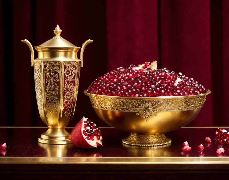 Prompt: "Pomegranate with almandine garnet arils a bowl of ruby pomegranates in a room full of treasure, cut pomegranate, dragons horde, stacks of gold coins, gold cups."