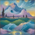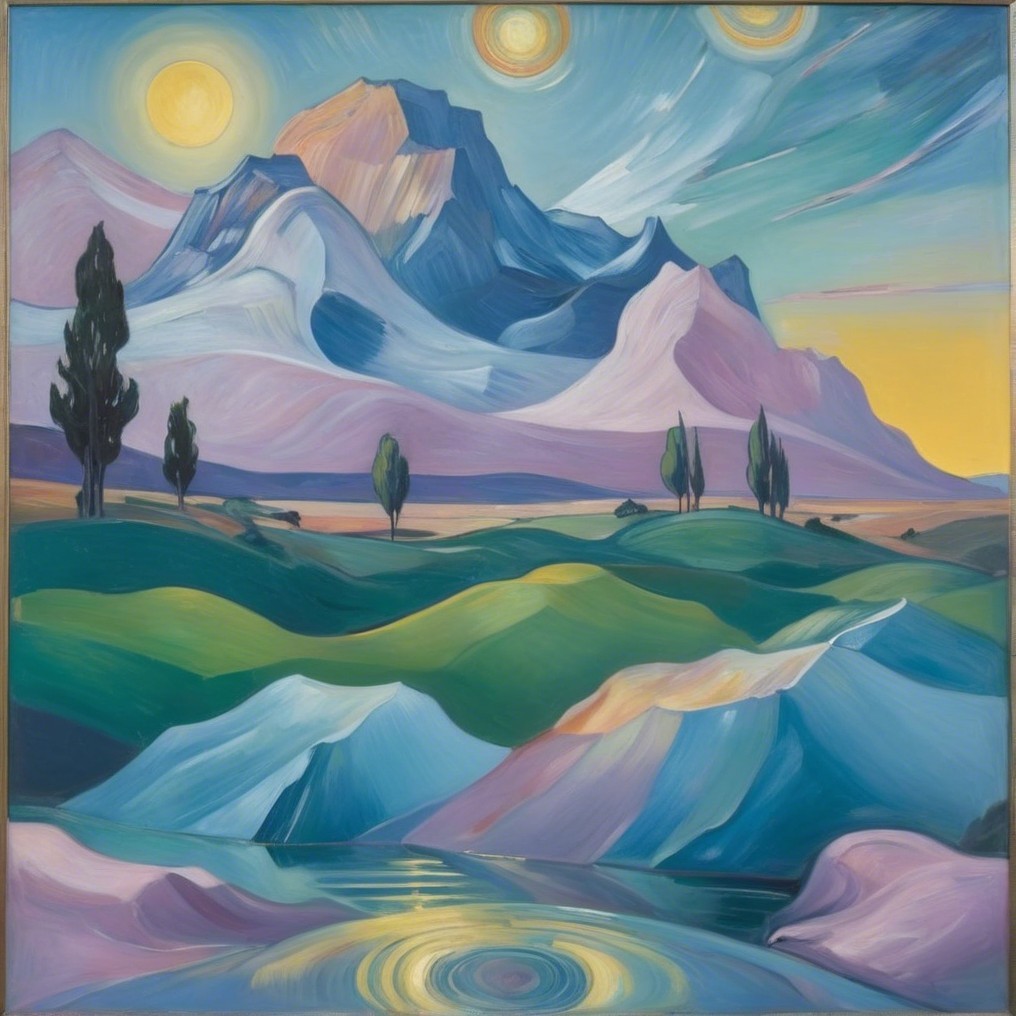 A vibrant landscape featuring stylized mountains in pastel hues, framed by rolling hills and slender trees, with a serene water surface reflecting the colorful sky and sun.