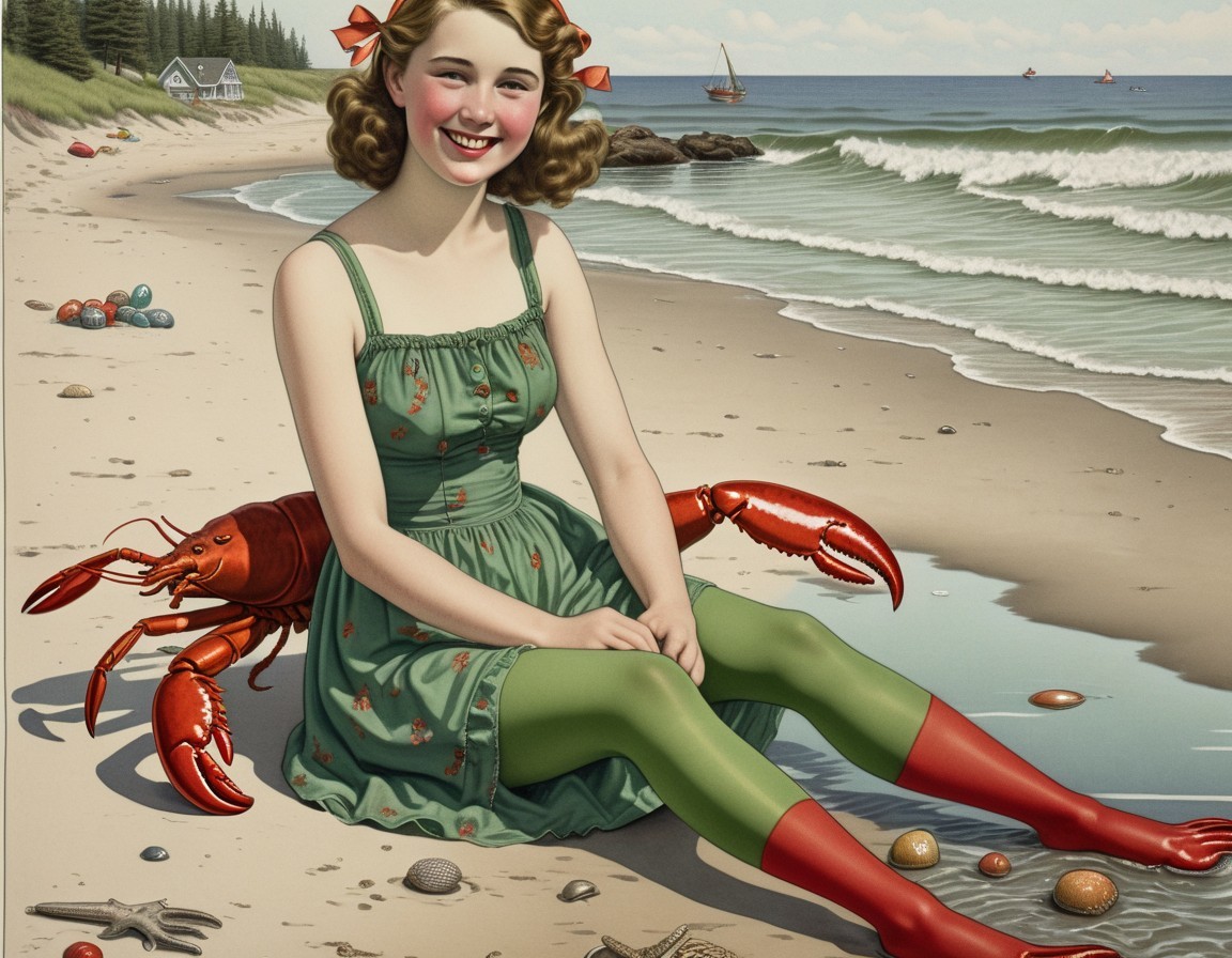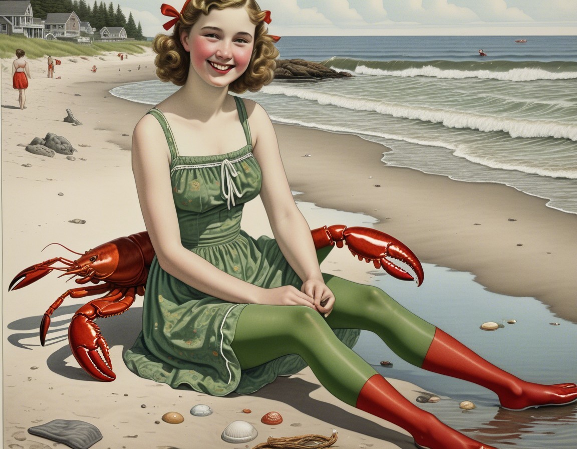 A cheerful woman in a green dress and red stockings sits on a beach, smiling next to a large lobster. The scene features gentle waves and a peaceful coastal backdrop.