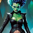 Prompt: the bride of Frankenstein, green & blue skin, curvaceous female standing and facing foreword, messy hair, woman full body, athletic build, large breasts, seductive, shapely, black tattered lace clothes