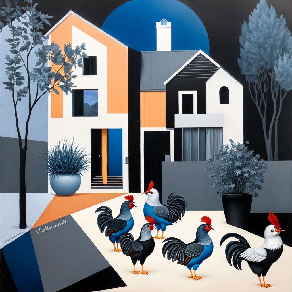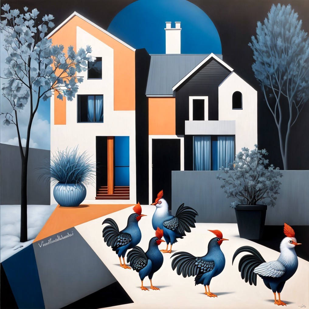 A vibrant painting depicts stylized, geometric houses with sharp contrasts and a group of whimsical, colorful birds in the foreground.