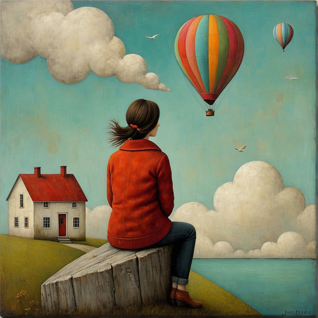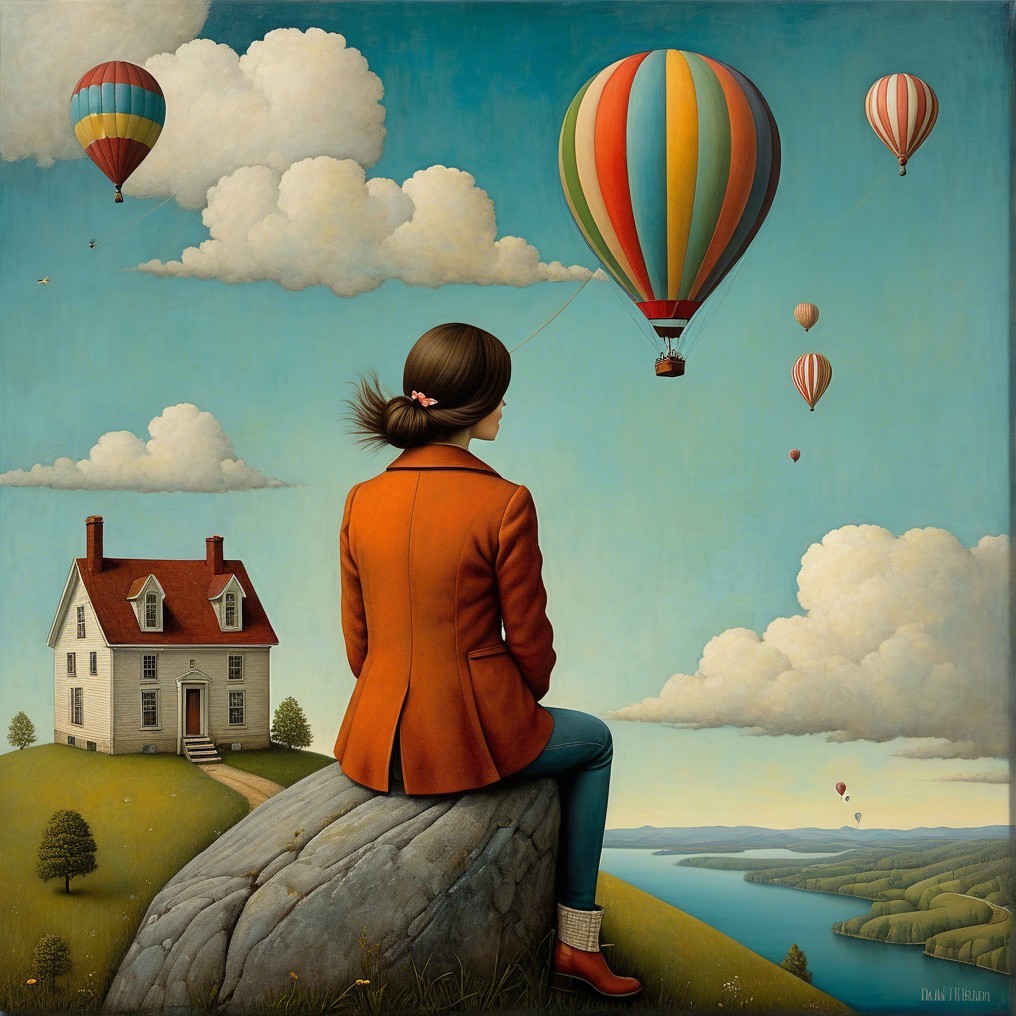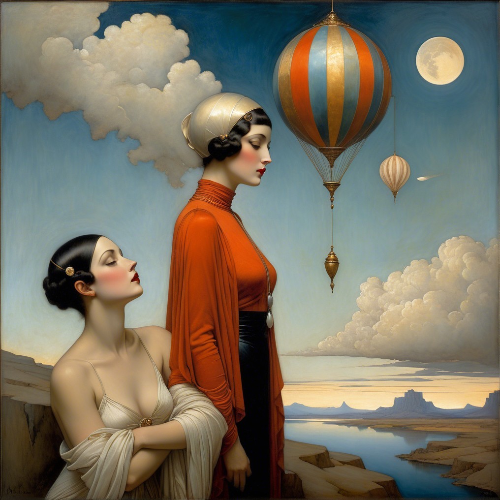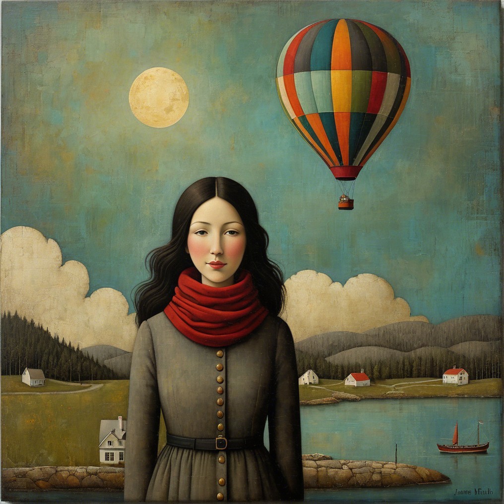 A serene woman with curly hair gazes intently, adorned in a silver dress. Behind her, a celestial landscape features a glowing moon and planets, blending earthy tones with a night sky.
