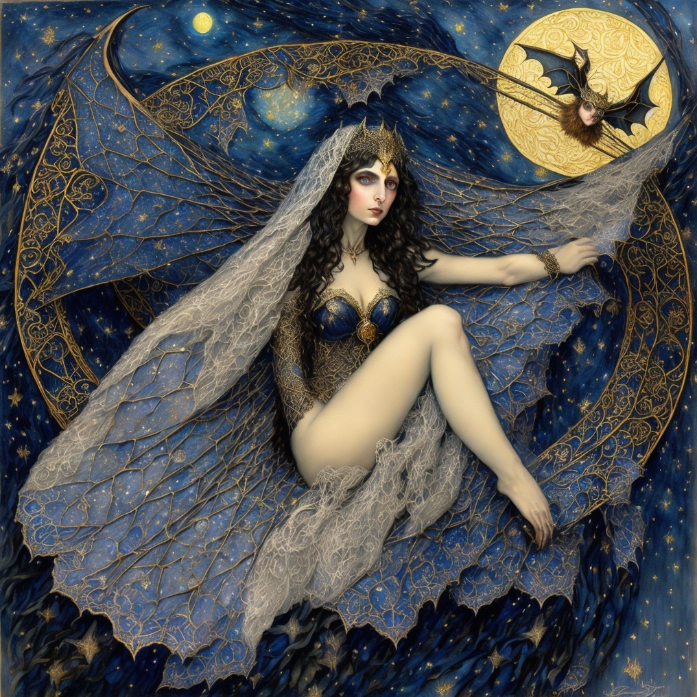 + Prompt:“angel of night, of history and death and of light”. Dark gothic gypsy sorcerer bat woman of the night, spider web veil, in the style of Wolfe Von Lenkiewicz ,style klimt e Van Gogh