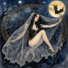 A mystical figure draped in a flowing veil sits gracefully amidst a web, surrounded by bats and a glowing moon, embodying elegance and a hint of darkness in a captivating night scene.