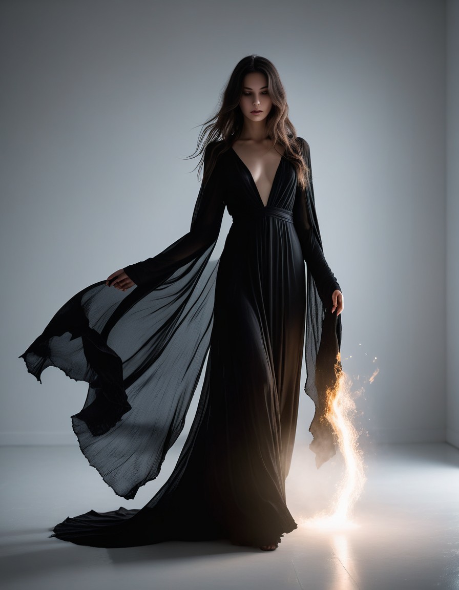 A woman in a flowing black gown stands confidently, her dress billowing around her. A flicker of flame emerges at her feet, creating a striking contrast against the serene backdrop.