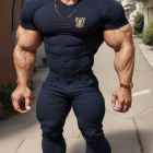 A muscular man stands confidently on a street, wearing a fitted navy shirt and pants. His impressive physique is accentuated, showcasing his broad shoulders and powerful build.