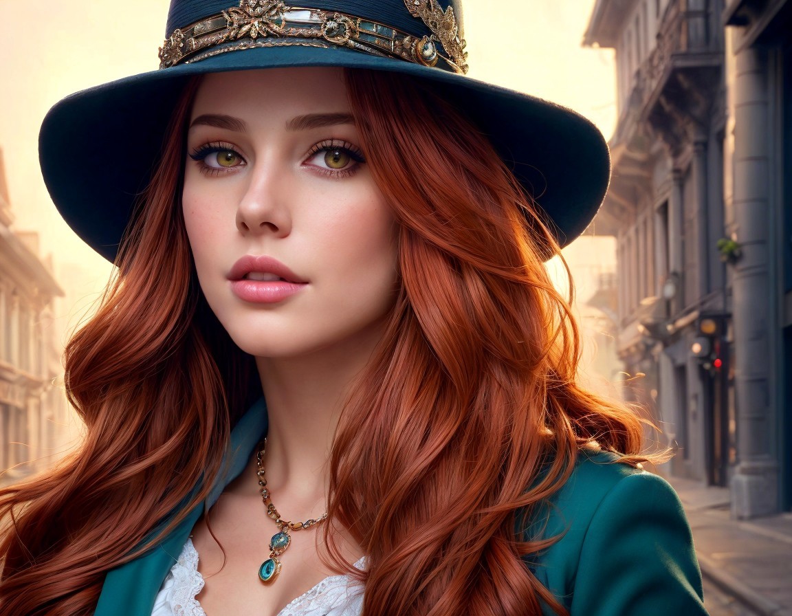 Prompt: "Full body portrait of a beautiful woman with auburn hair, deep cleavage, buxom, large breasts, in a hat walking down a street, photo shoot for a magazine, fantasy, deep colors, detailed Illustration, a character portrait by Magali Villeneuve, fantasy art, style of laura sava, art style of noel coypel, art style of Luis Royo"