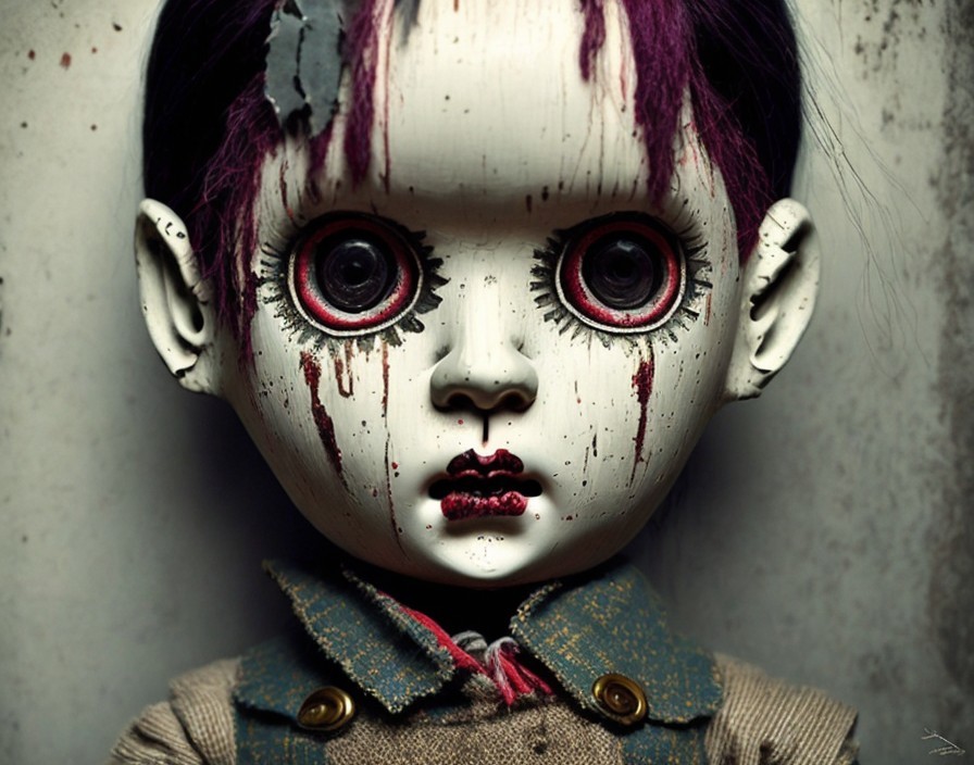 Spooky doll with red eyes, cracked face paint, and purple hair on rusty backdrop