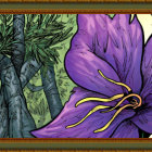 A sleepy skunk lies on a purple cloth, surrounded by lush green leaves. In the background, a blue floral vase adds a touch of elegance to the serene, cozy composition.