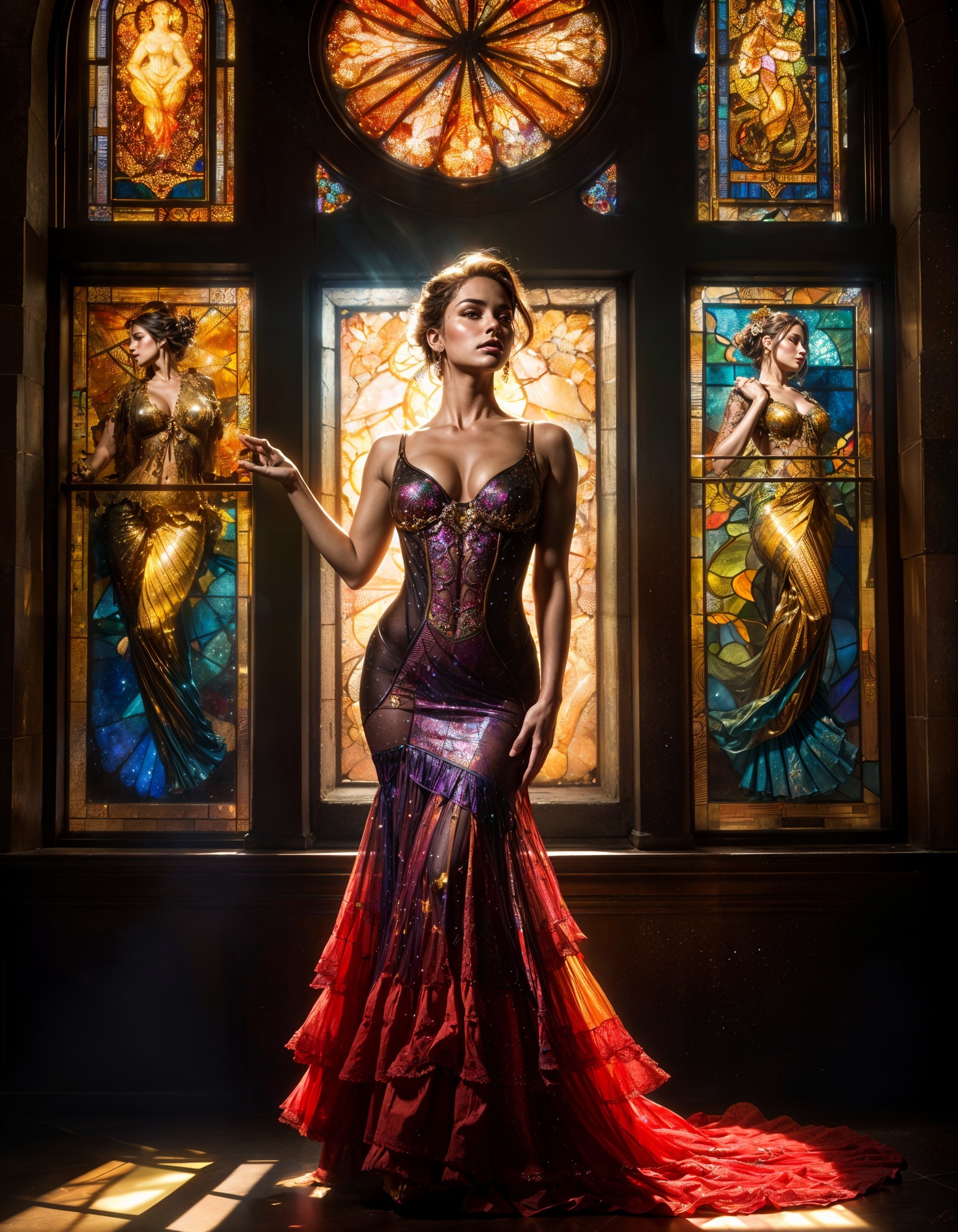 Full body portrait of a beautiful Woman standing in front of a stained glass window and bathed in ambient mysterious light, full-body flamenco dancer is wearing ceremonial dress, style by Thomas Kinkade+David A. Hardy+Carne Griffiths+Mandy Disher, key light reflecting in eyes, hyper-detailed textures, stunning realism, awarded-winning composition with perfect lighting, mind-blowing visual impact, hyperrealistic with staggering detail, capturing the essence of beauty in a stunning display of perfect lighting, mind-blowing in its intricate execution, worthy of an award-winning photography exhibit, ultra clear, dramatic lighting, golden ratio, octane rendering, perfect composition and lighting, best quality, high detailed, detailed faces, cute, adorable, fairytale, storybook detailed illustration, cinematic, ultra highly detailed, tiny details, beautiful details, mystical, luminism, vibrant colors. Fiery-haired enchantress with a porcelain complexion, cascading crimson locks, and divine allure. She has large, expressive eyes that capture the morning light, creating a playful sparkle, happiness, pleasure. The full-body enchantress is wearing a stunning dress with dewdrops on her hair, reflecting the morning light. Background is a dreamy, sunlit meadow filled with wildflowers. Soft golden light shines down, creating a whimsical and dreamy atmosphere, warm and cheerful, echoes of Birth of Venus, sheer drapery, graceful and refined, mystical aura, romantic scenery, dreamy hues. Lighting on her face is soft and diffuse, blending naturally with the background sunlight, golden hour, grainy, noise, cinematic, deep depth of field, 3D, 16k resolution, a masterpiece, breathtaking intricate details, reflective catchlights, high quality.