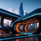 A futuristic, metallic architecture features sleek, glowing elements and curved designs. In the background, a vibrant skyline with towering skyscrapers reflects on calm waters at sunset.