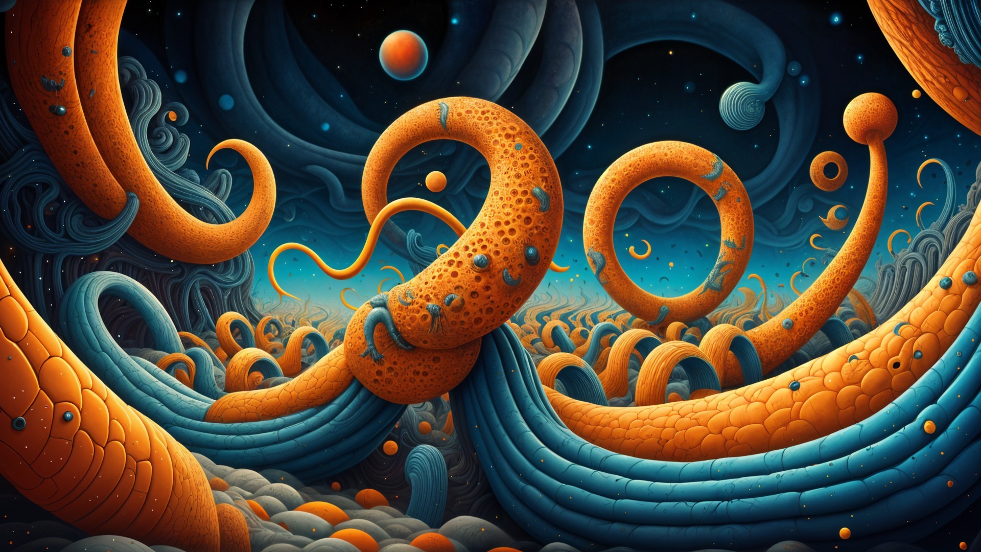 The image showcases a mesmerizing abstract composition with swirling, orange and teal patterns reminiscent of worms or waves, creating a vibrant, otherworldly atmosphere filled with circular shapes.