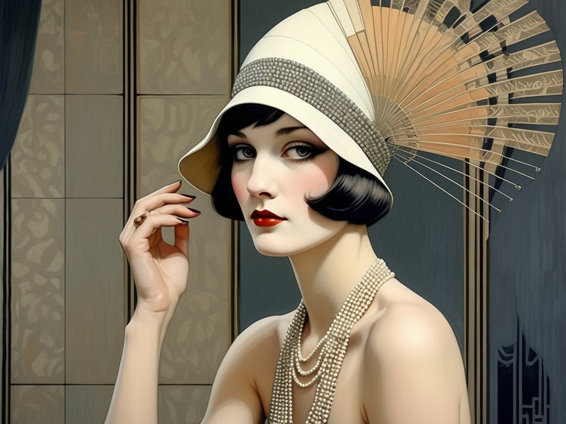 A glamorous figure from the Roaring Twenties, adorned with a stylish cloche hat featuring feathers, and elegant makeup. The background showcases intricate art deco designs, enhancing her vintage allure.