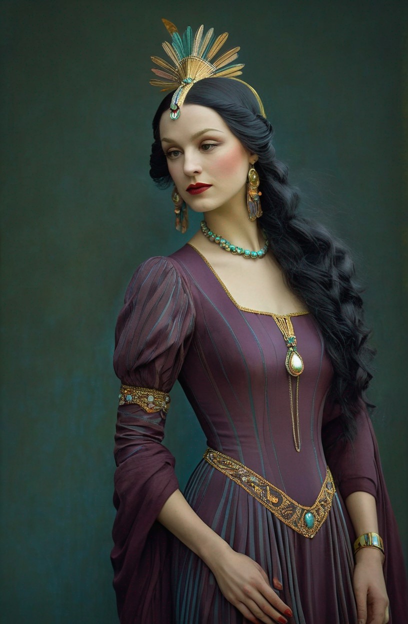 + Prompt:Single image. Art deco. She had been born with a face that would let her get her way Big. Cirque de soleil, A nymph of circus and comedy. colors: torquoise, pale salmon, persimmon, grey-green , pale lemon yellow, greenish gold, metallic bronze.