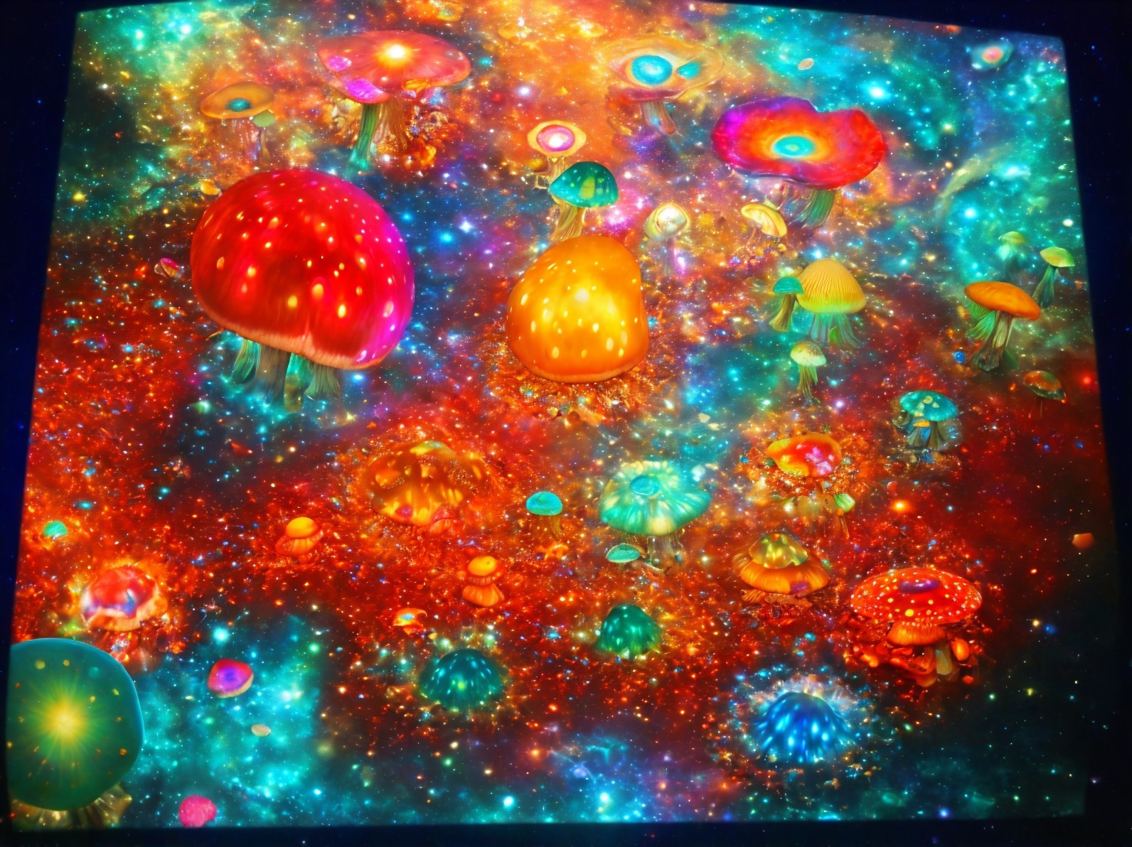 Colorful Mushrooms in Cosmic Setting: Vibrant digital art with stylized mushrooms on starry backdrop