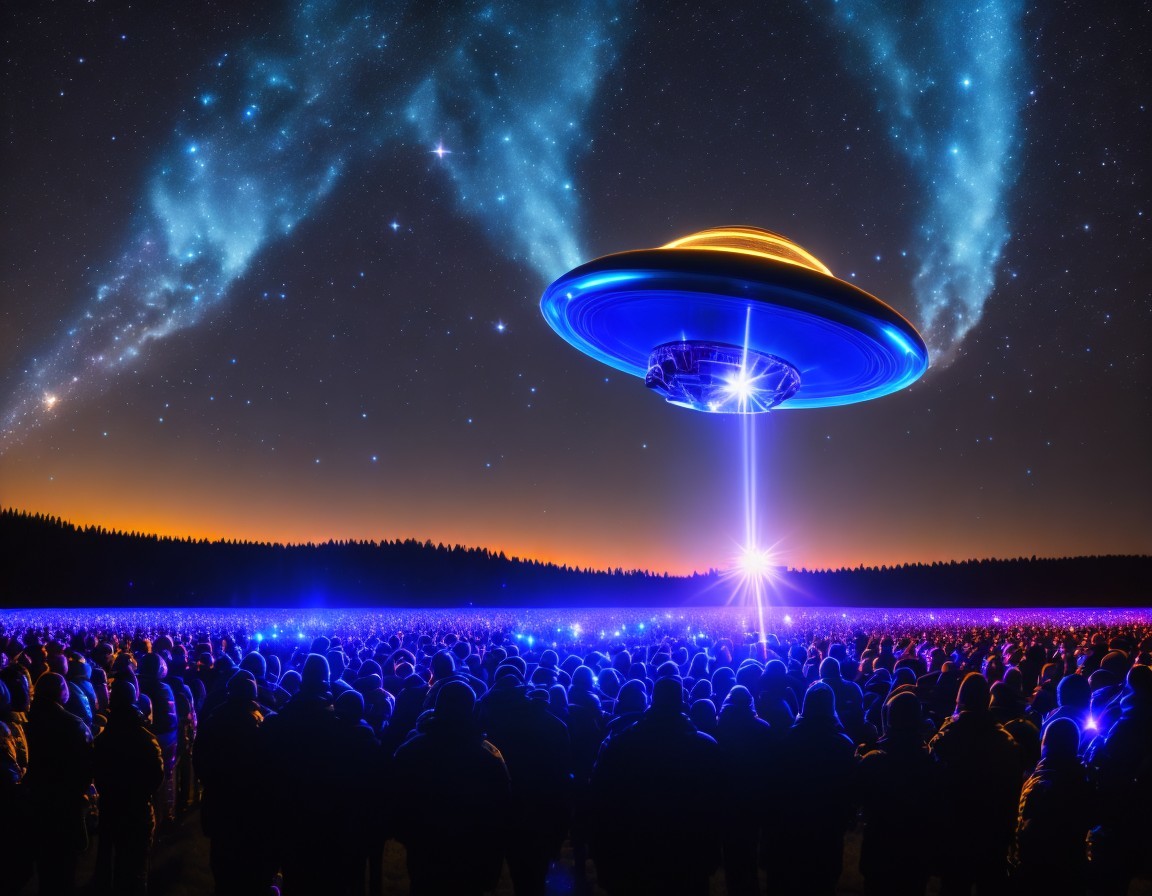 Magical holographic uap ufo with usa marked craft event with a bright bluish light beaming towards an open awestruck crowd of aliens unbelievably staring at the uaps above in the brightly lit night sky on an alien planet